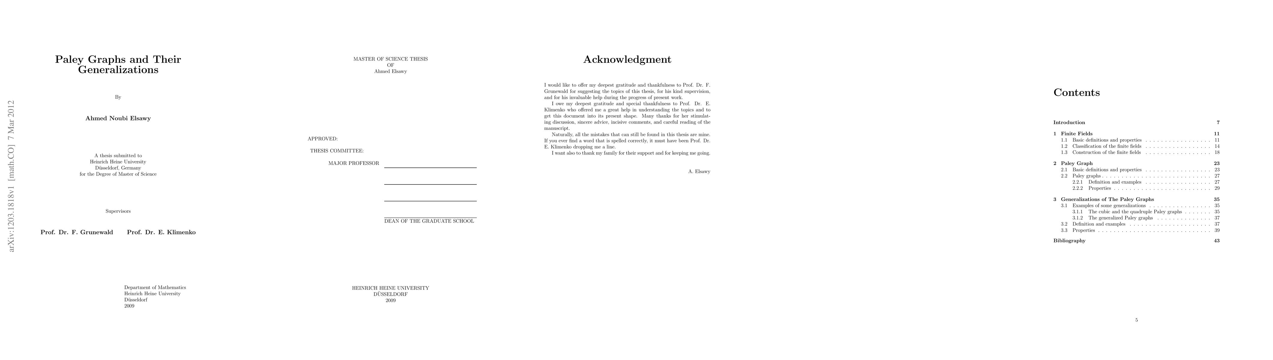 To construct a Paley graph, we fix a finite field and consider its elements as vertices of the Paley graph. Two vertices are connected by an edge if their difference is a square in the field. We will study some important properties of the Paley graphs. In particular, we will show that the Paley graphs are connected, symmetric, and self-complementary. Also we will show that the Paley graph of order q is (q-1)/2 -regular, and every two adjacent vertices have (q-5)/4 common neighbors, and every two non-adjacent vertices have q-1/4 common neighbors, which means that the Paley graphs are strongly regular with parameters(q,q-1/2,q-5/4, q-1/4). Paley graphs are generalized by many mathematicians. In the first section of Chapter 3 we will see three examples of these generalizations and some of their basic properties. In the second section of Chapter 3 we will define a new generalization of the Paley graphs, in which pairs of elements of a finite field are connected by an edge if and only if there difference belongs to the m-th power of the multiplicative group of the field, for any odd integer m > 1, and we call them the m-Paley graphs. In the third section we will show that the m-Paley graph of order q is complete if and only if gcd(m, q - 1) = 1 and when d = gcd(m, q - 1) > 1, the m-Paley graph is q-1/d -regular. Also we will prove that the m-Paley graphs are symmetric but not self-complementary. We will show also that the m-Paley graphs of prime order are connected but the m-Paley graphs of order p^n, n > 1 are not necessary connected, for example they are disconnected if gcd(m, p^n - 1) =(p^n-1)/ 2.