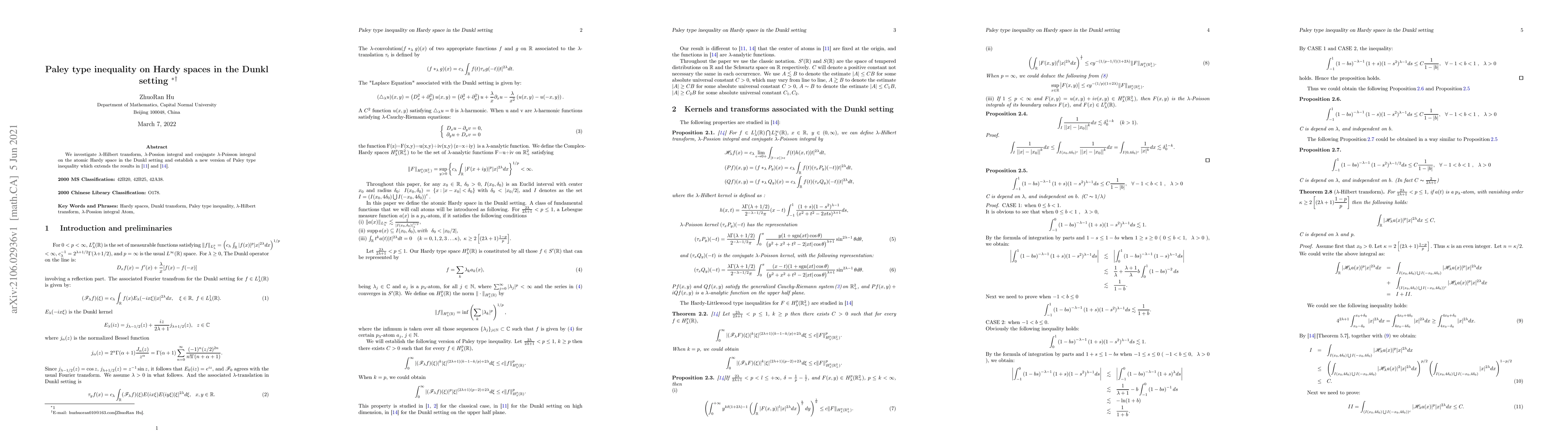 Summary: This paper explores $\lambda$-Hilbert and $\lambda$-Poisson transforms on atomic Hardy space within the Dunkl setting, establishing a new Paley type inequality that extends previous results from \cite{F} and \cite{ZhongKai Li 3}.