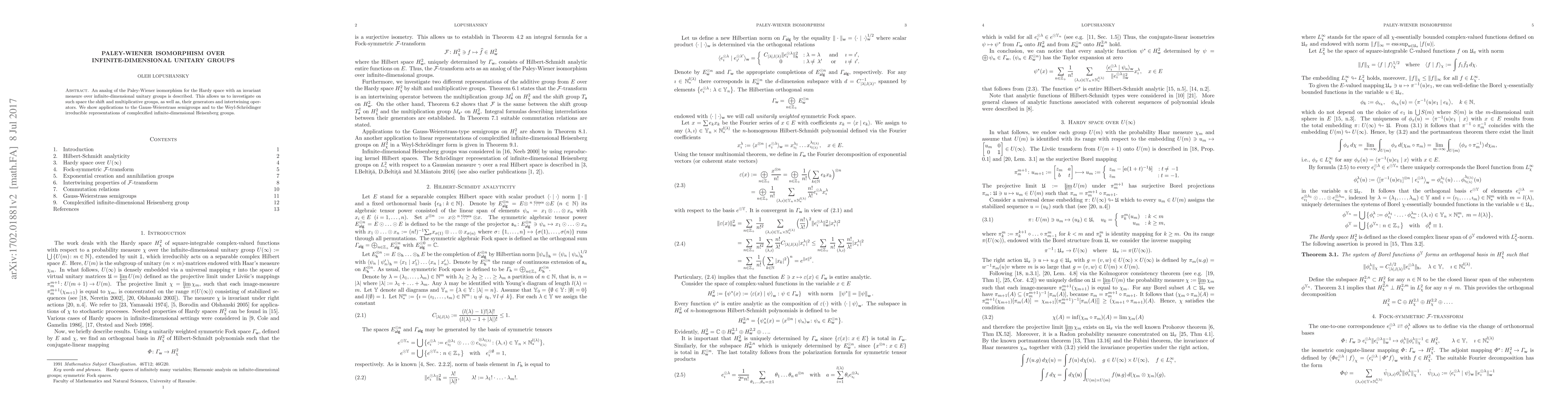An analog of the Paley-Wiener isomorphism for the Hardy space with an invariant measure over infinite-dimensional unitary groups is described. This allows us to investigate on such space the shift and multiplicative groups, as well as, their generators and intertwining operators. We show applications to the Gauss-Weierstrass semigroups and to the Weyl-Schr\"odinger irreducible representations of complexified infinite-dimensional Heisenberg groups.