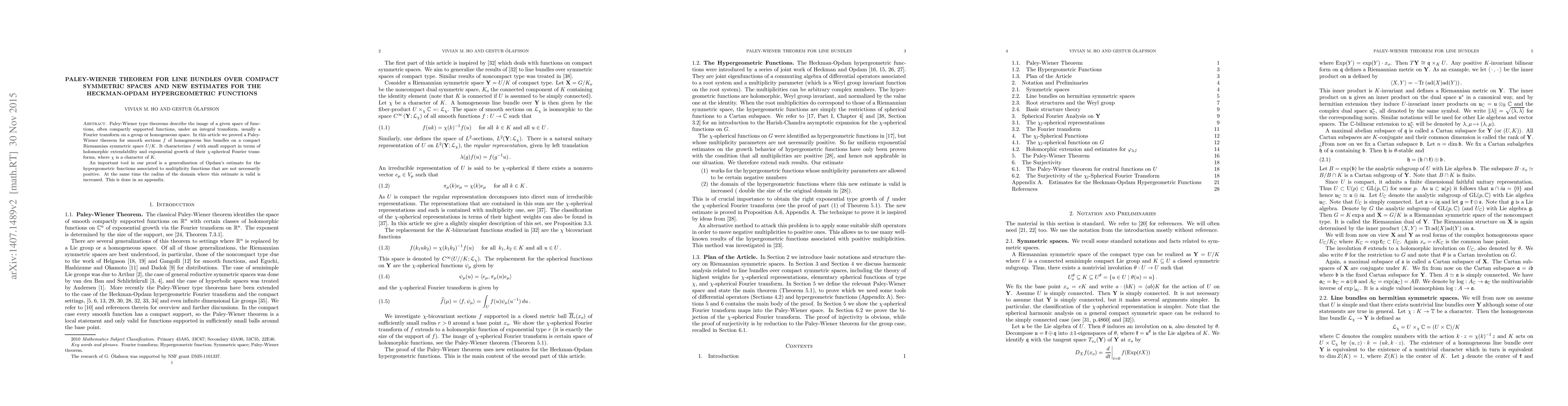 This paper proves a Paley-Wiener theorem for line bundles over compact symmetric spaces, characterizing functions with small support via holomorphic extendability and Fourier transform growth. It also generalizes Opdam's hypergeometric function estimates for non-positive multiplicity functions, expanding the applicable domain.