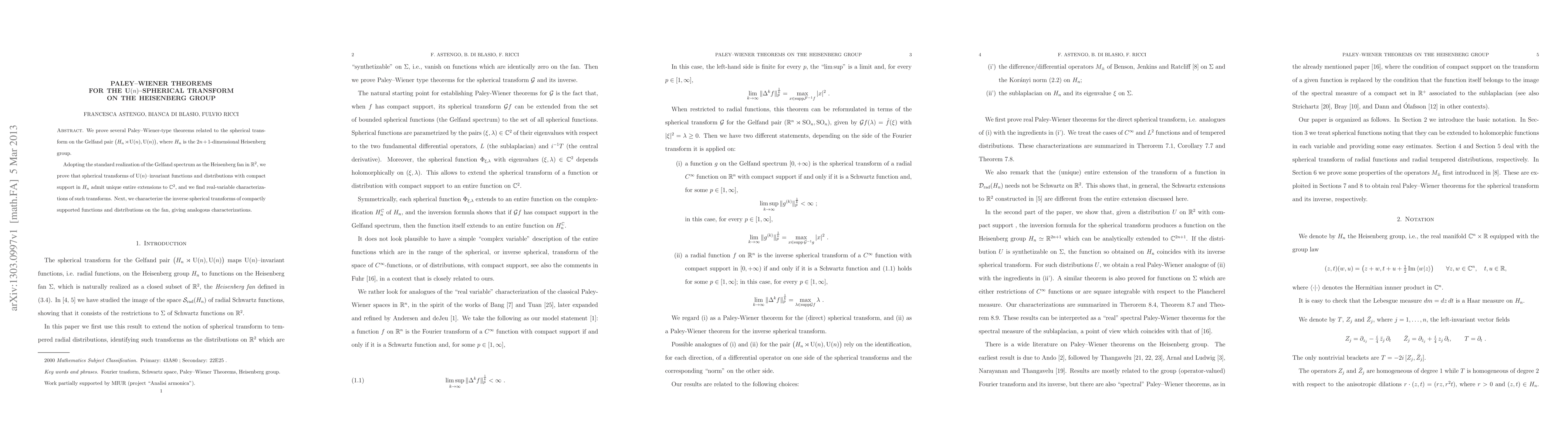 We prove several Paley--Wiener-type theorems related to the spherical transform on the Gelfand pair $\big(H_n\rtimes U(n),U(n)\big)$, where $H_n$ is the $2n+1$-dimensional Heisenberg group. Adopting the standard realization of the Gelfand spectrum as the Heisenberg fan in ${\mathbb R}^2$, we prove that spherical transforms of $ U(n)$--invariant functions and distributions with compact support in $H_n$ admit unique entire extensions to ${\mathbb C}^2$, and we find real-variable characterizations of such transforms. Next, we characterize the inverse spherical transforms of compactly supported functions and distributions on the fan, giving analogous characterizations.