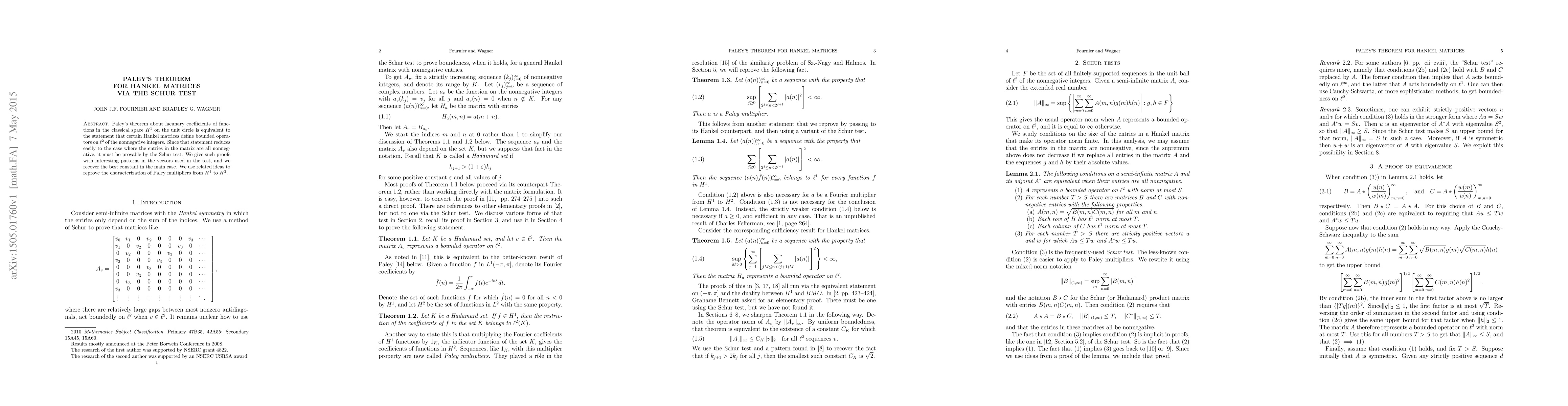 This paper proves Paley's theorem for Hankel matrices using the Schur test, showing that certain Hankel matrices define bounded operators on $\ell^2$ of nonnegative integers. The authors also reprove the characterization of Paley multipliers from $H^1$ to $H^2$ using similar techniques.