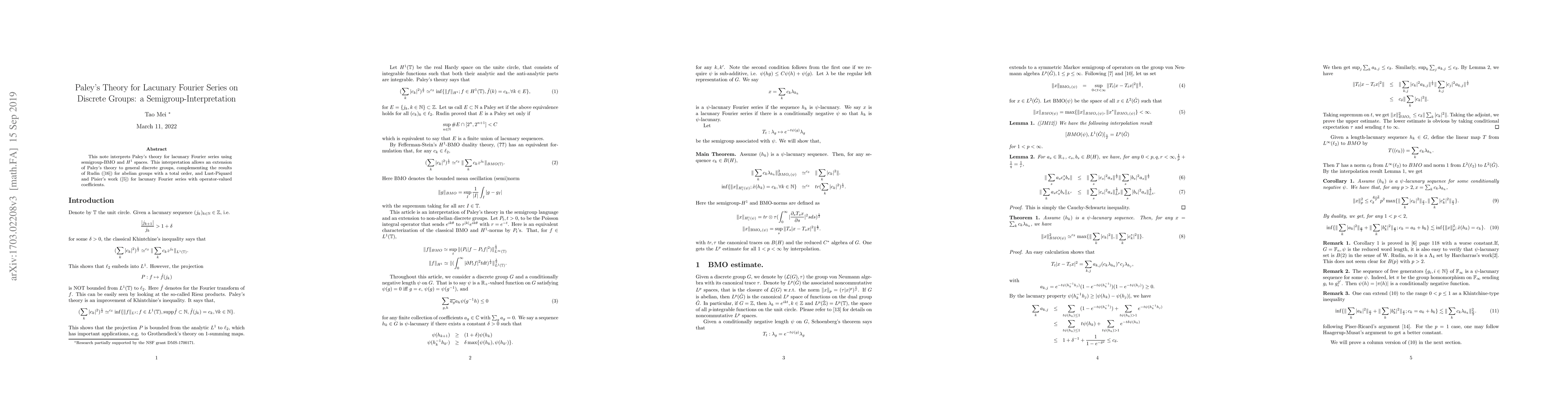 The main result is a Paley's theory for lacunary Fourier series using semigroup-BMO and $H^1$ spaces. This interpretation allows an extension of Paley's theory to general discrete groups, complementing the work of Rudin for abelian groups with a total order, and Lust-Piquard and Pisier's work for lacunary Fourier series with operator-valued coefficients.
