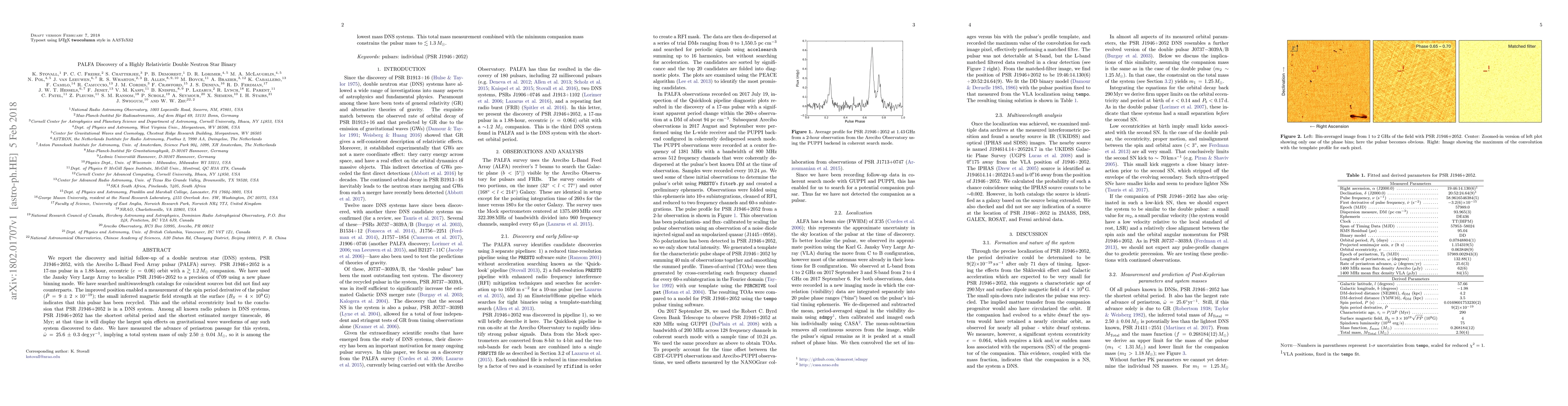 The PALFA survey discovered a highly relativistic double neutron star binary, PSR J1946$+$2052, with a short 1.88-hour eccentric orbit and a low mass total of 2.50 $M_\odot$. This system has the shortest orbital period and merger timescale among known DNS systems, predicting significant gravitational wave effects.