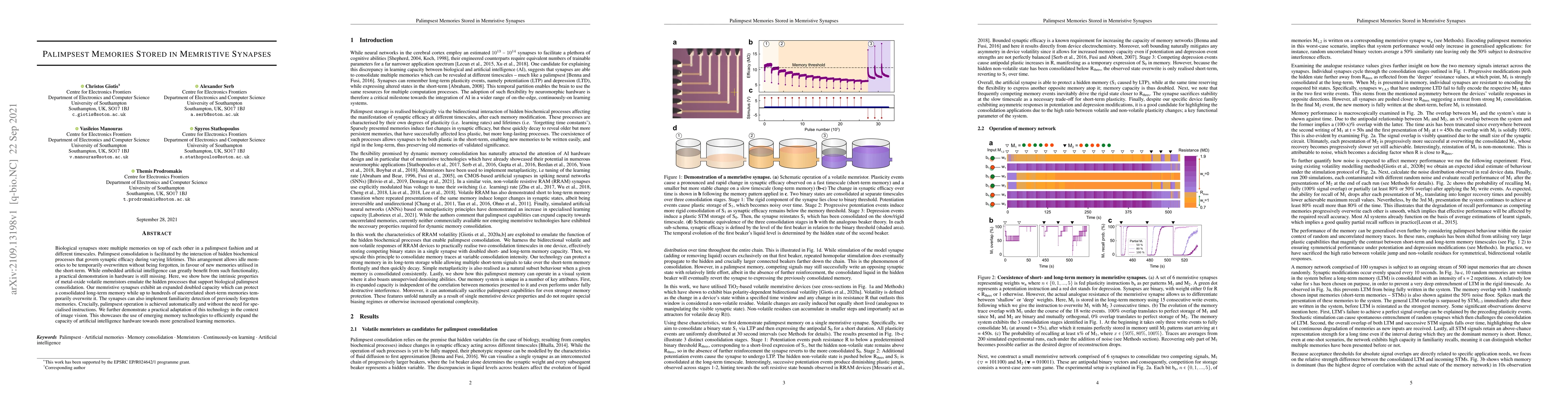 This paper demonstrates how metal-oxide volatile memristors can emulate biological palimpsest memory consolidation, allowing long-term memories to coexist with temporary short-term overwrites. The memristive synapses achieve this functionality automatically, enhancing the capacity of artificial intelligence systems for generalized learning.
