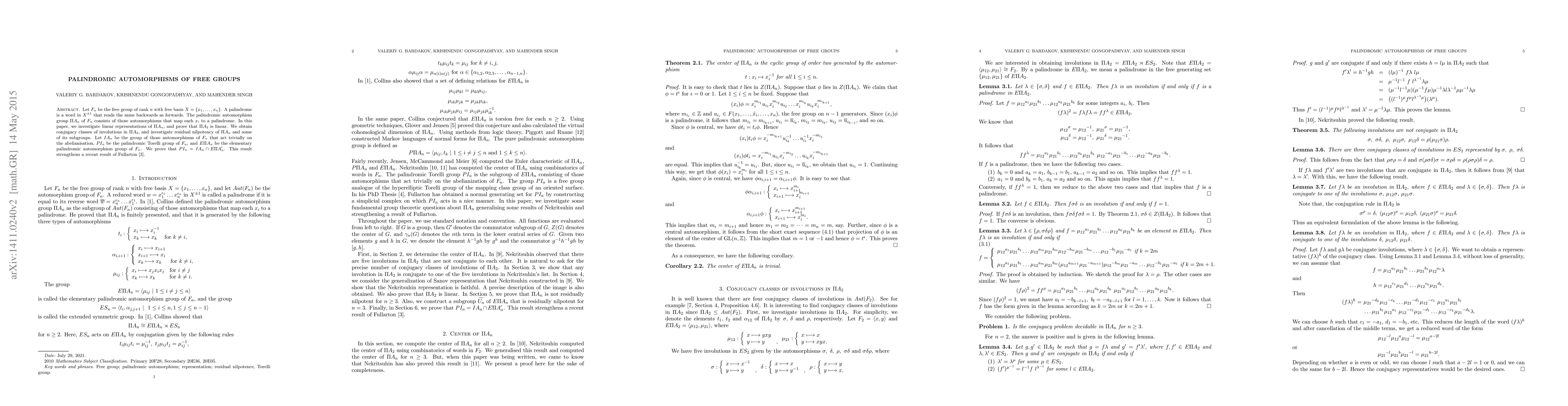 This paper investigates the palindromic automorphism group $\Pi A_n$ of the free group $F_n$, demonstrating that $\Pi A_2$ is linear and exploring its conjugacy classes of involutions. It also studies the residual nilpotency of $\Pi A_n$ and proves that $PI_n = IA_n \cap E \Pi A_n'$ for the palindromic Torelli group $P I_n$.