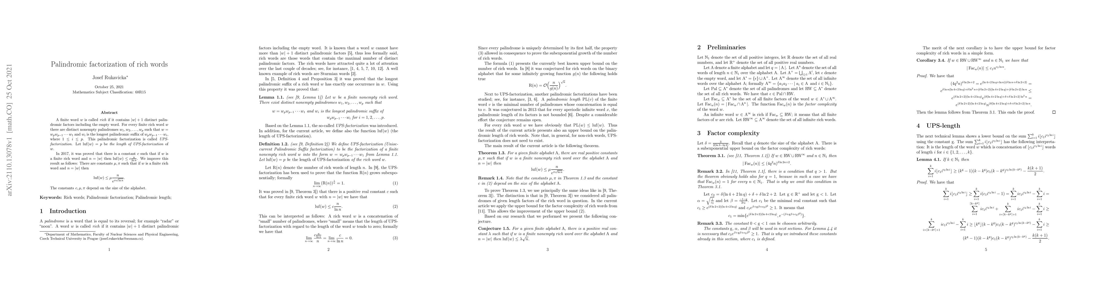 A finite word $w$ is called \emph{rich} if it contains $\vert w\vert+1$ distinct palindromic factors including the empty word. For every finite rich word $w$ there are distinct nonempty palindromes $w_1, w_2,\dots,w_p$ such that $w=w_pw_{p-1}\cdots w_1$ and $w_i$ is the longest palindromic suffix of $w_pw_{p-1}\cdots w_i$, where $1\leq i\leq p$. This palindromic factorization is called \emph{UPS-factorization}. Let $luf(w)=p$ be \emph{the length of UPS-factorization} of $w$. In 2017, it was proved that there is a constant $c$ such that if $w$ is a finite rich word and $n=\vert w\vert$ then $luf(w)\leq c\frac{n}{\ln{n}}$. We improve this result as follows: There are constants $\mu, \pi$ such that if $w$ is a finite rich word and $n=\vert w\vert$ then \[luf(w)\leq \mu\frac{n}{e^{\pi\sqrt{\ln{n}}}}\mbox{.}\] The constants $c,\mu,\pi$ depend on the size of the alphabet.