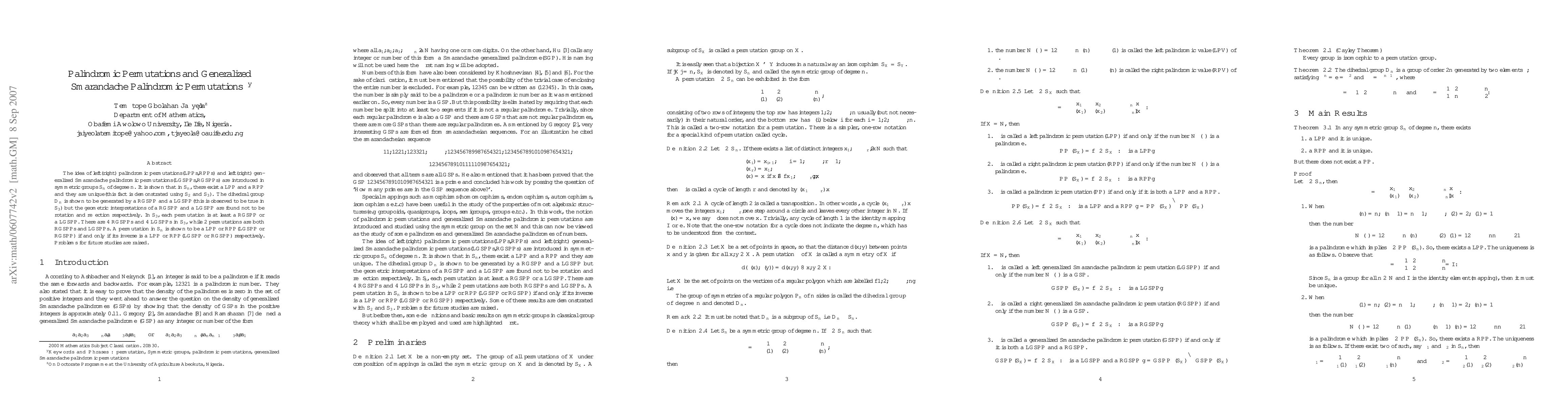 The idea of left(right) palindromic permutations(LPPs,RPPs) and left(right) generalized Smarandache palindromic permutations(LGSPPs,RGSPPs) are introduced in symmetric groups S_n of degree n. It is shown that in S_n, there exist a LPP and a RPP and they are unique(this fact is demonstrated using S_2 and S_3). The dihedral group D_n is shown to be generated by a RGSPP and a LGSPP(this is observed to be true in S_3) but the geometric interpretations of a RGSPP and a LGSPP are found not to be rotation and reflection respectively. In S_3, each permutation is at least a RGSPP or a LGSPP. There are 4 RGSPPs and 4 LGSPPs in S_3, while 2 permutations are both RGSPPs and LGSPPs. A permutation in S_n is shown to be a LPP or RPP(LGSPP or RGSPP) if and only if its inverse is a LPP or RPP(LGSPP or RGSPP) respectively. Problems for future studies are raised.