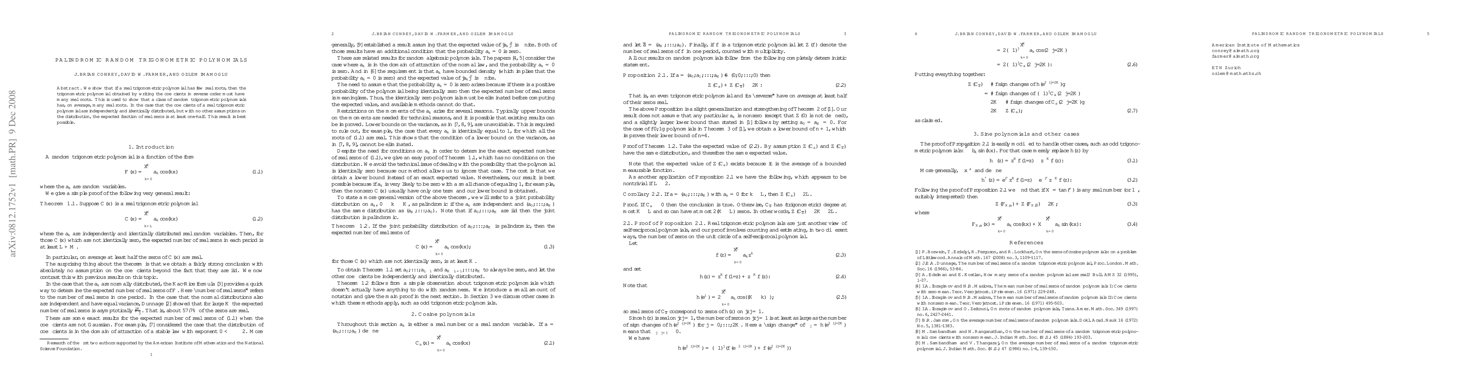 Summary: The paper demonstrates that a real trigonometric polynomial with few real roots, when reversed, tends to have many real roots. It concludes that random trigonometric polynomials typically have many real roots, with the expectation of at least half of their zeros being real under certain distribution assumptions.