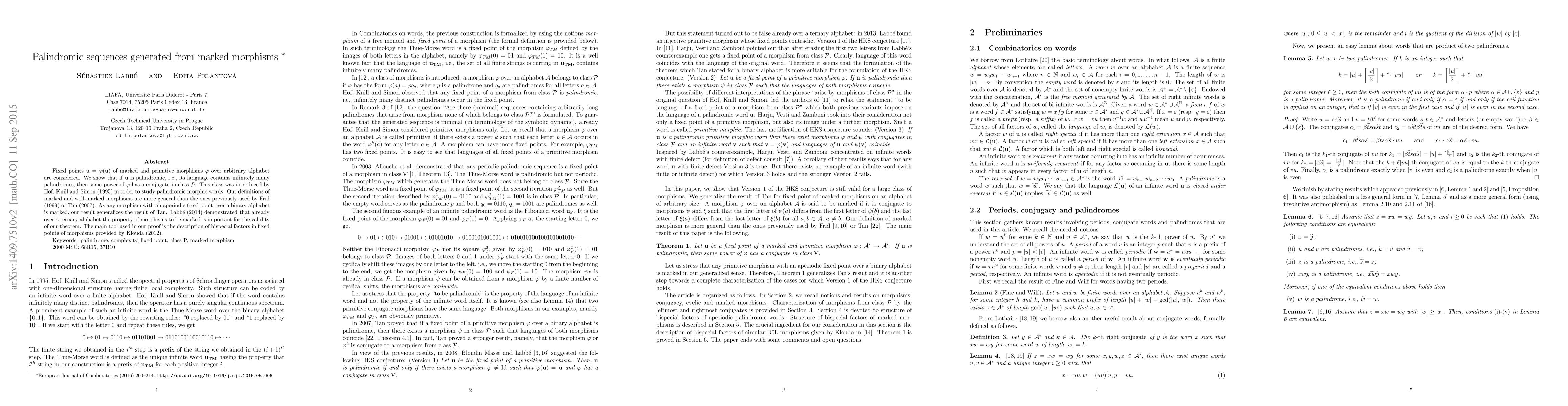 This research paper shows that if a palindromic sequence is generated from a marked morphism, then some power of the morphism has a conjugate in class P, where P is a set used to study palindromic words. The result generalizes previous findings and expands the scope of the property to more than binary alphabet.