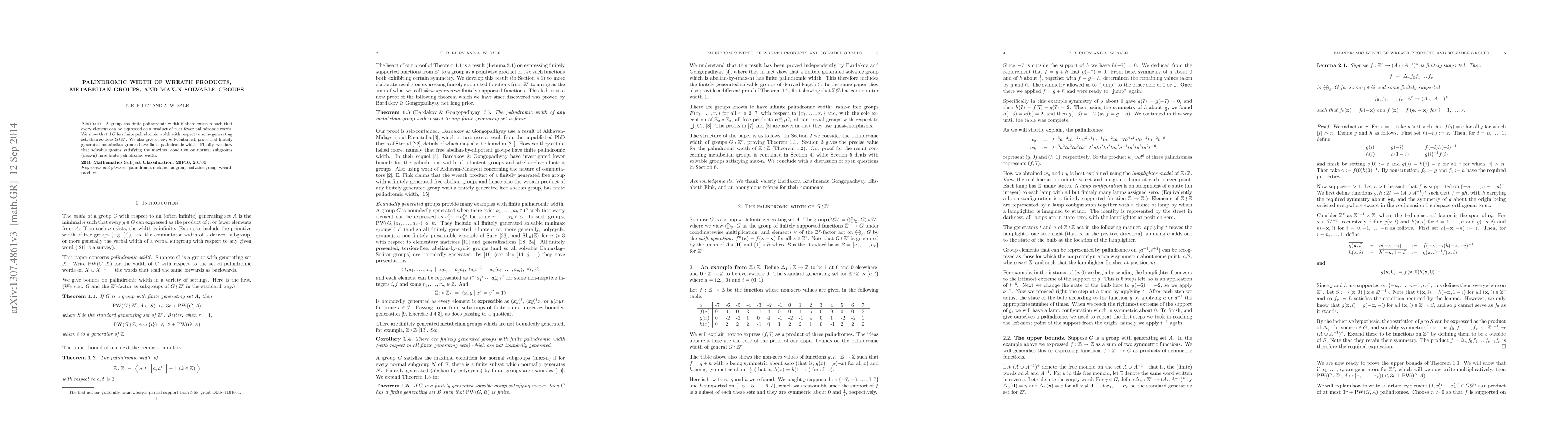 A group has finite palindromic width if there exists $n$ such that every element can be expressed as a product of $n$ or fewer palindromic words. We show that if $G$ has finite palindromic width with respect to some generating set, then so does $G \wr \mathbb{Z}^{r}$. We also give a new, self-contained, proof that finitely generated metabelian groups have finite palindromic width. Finally, we show that solvable groups satisfying the maximal condition on normal subgroups (max-n) have finite palindromic width.