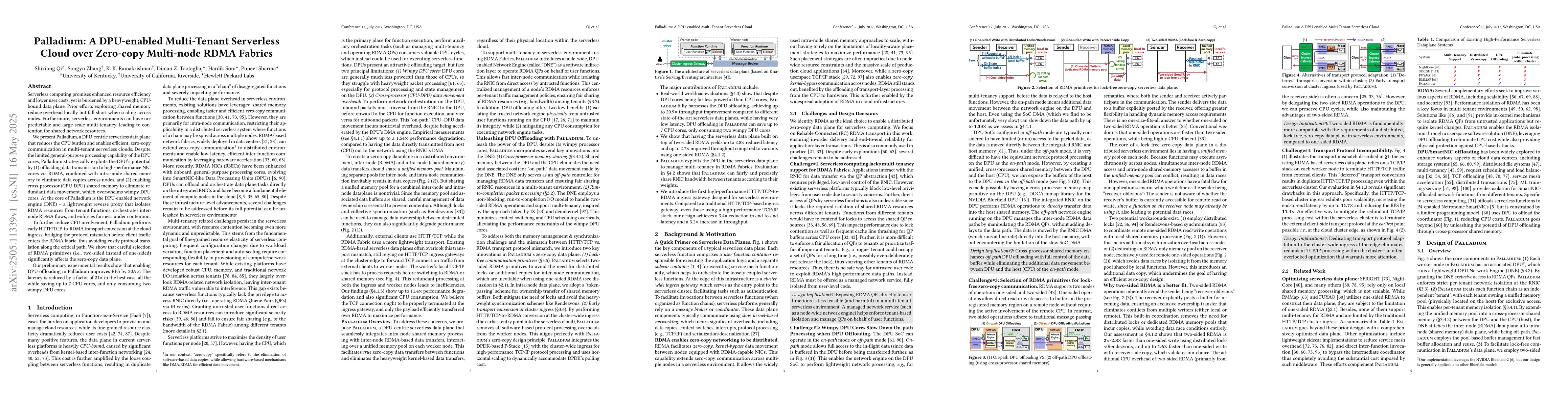 Palladium is a serverless cloud platform that reduces CPU burden and enables efficient zero-copy communication through DPU-enabled network engine and RDMA fabrics, improving RPS by 20.9x and reducing latency by up to 21x.