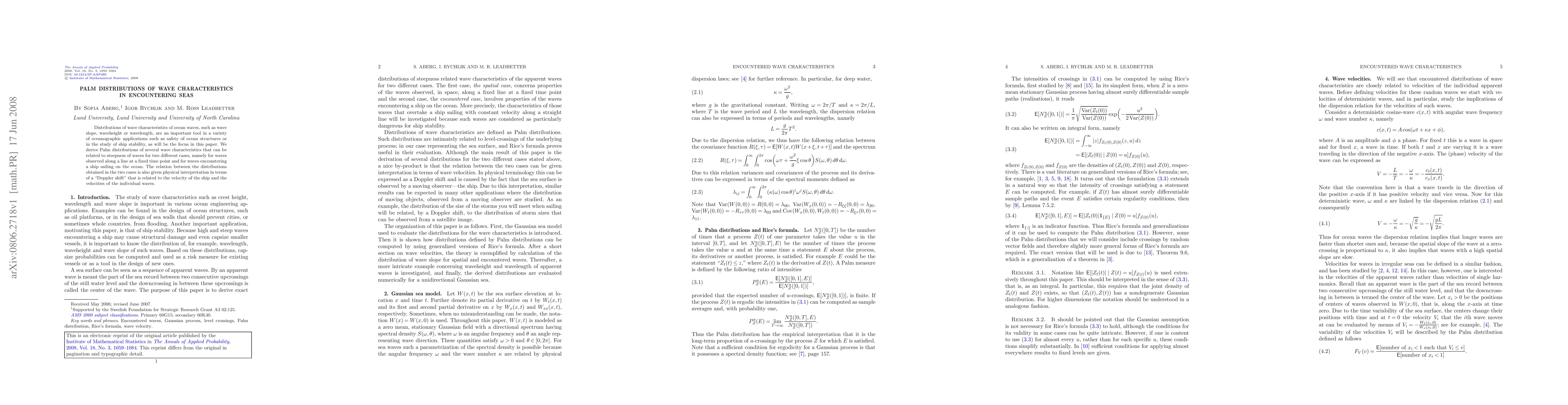Researchers derived Palm distributions of wave characteristics to study ocean waves' behavior in encountering seas, focusing on a "Doppler shift" related to ship velocity and wave velocities.