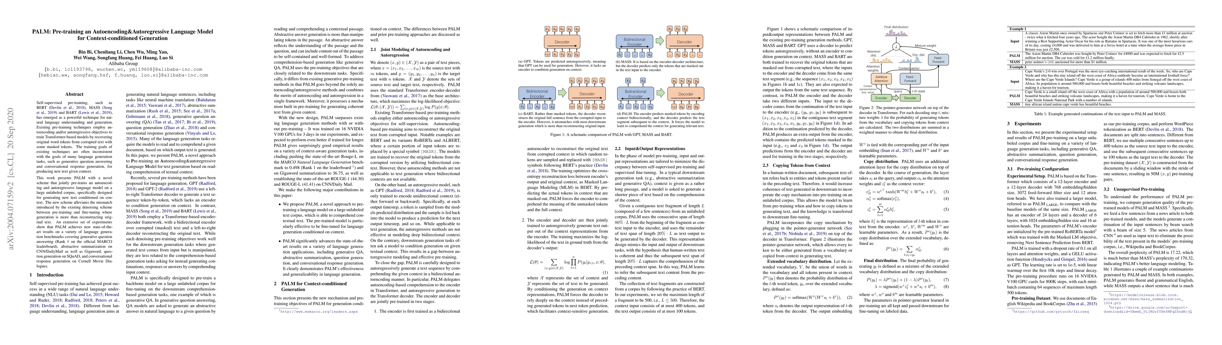 PALM jointly pre-trains an autoencoding and autoregressive language model for context-conditioned text generation, achieving state-of-the-art results on multiple language generation benchmarks. The novel scheme addresses the mismatch between pre-training and fine-tuning for generative tasks.