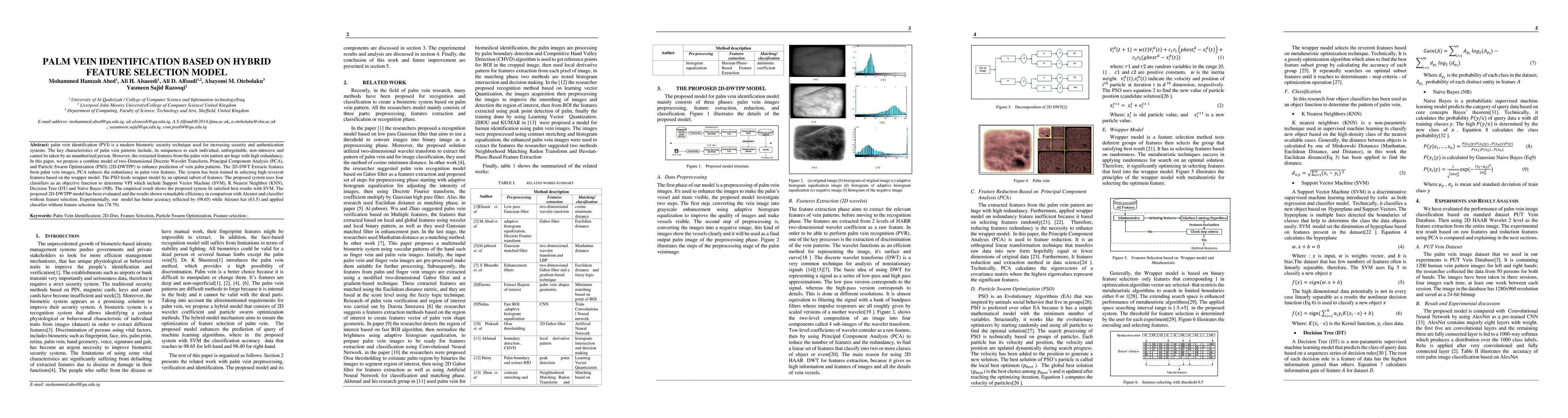 This paper proposes a hybrid feature selection model combining 2D-DWT, PCA, and PSO to enhance palm vein identification (PVI) accuracy. The system uses SVM for classification, achieving an accuracy of 98.65%, significantly outperforming Alexnet and classifiers without feature selection.