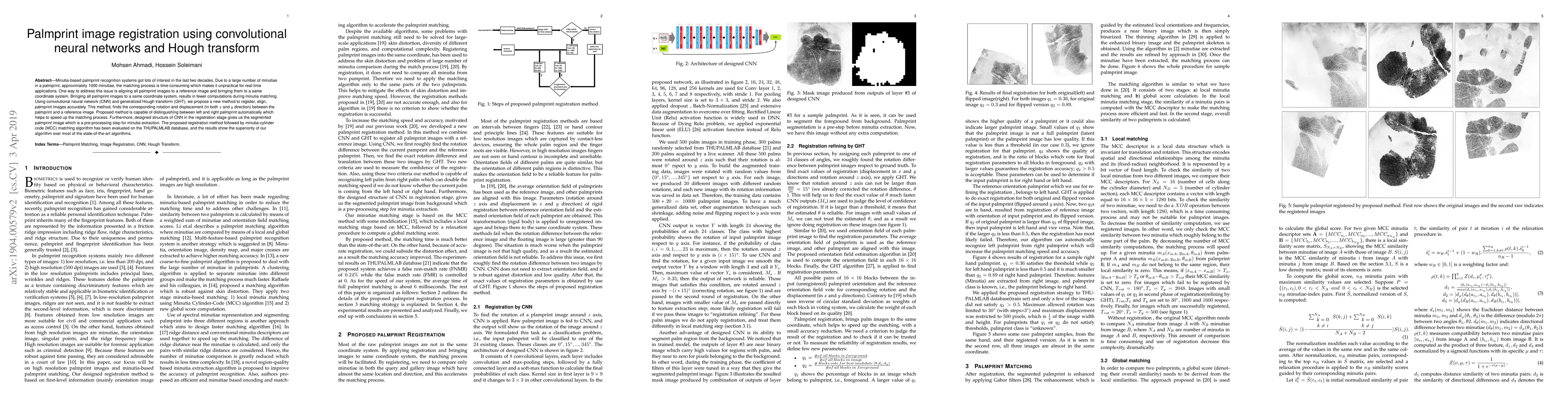 This paper proposes a method for palmprint image registration using convolutional neural networks (CNN) and generalized Hough transform (GHT) to align palmprints to a reference image, reducing computational load for minutia matching. The method accurately determines rotation and displacement, automatically distinguishes left and right palms, and segments palmprints for preprocessing, ultimately enhancing matching speed and accuracy.