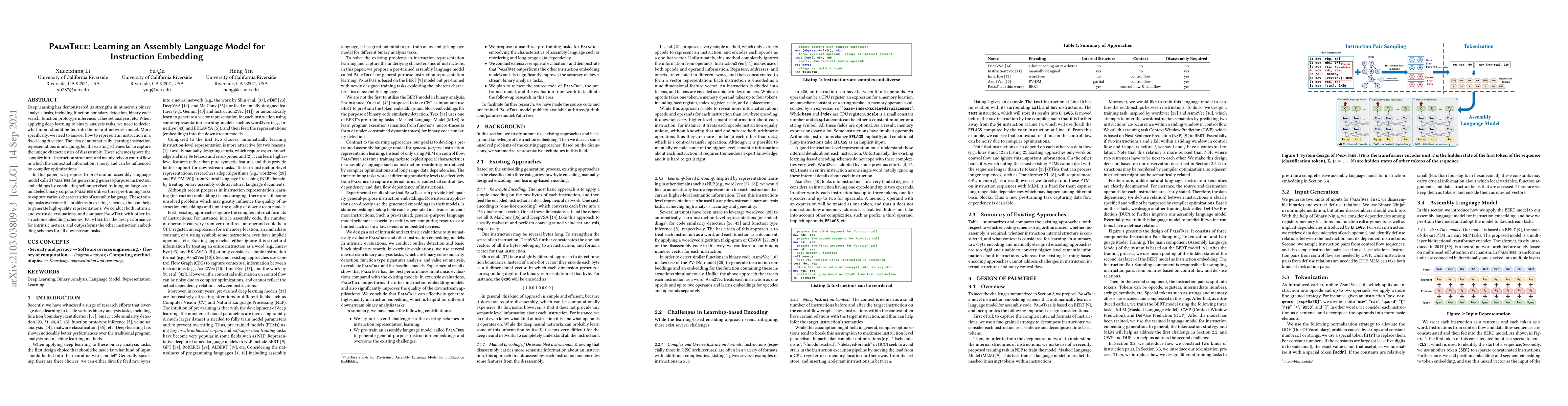 This paper introduces PalmTree, an assembly language model pre-trained via self-supervised learning to generate high-quality instruction embeddings. It outperforms existing methods by utilizing three pre-training tasks to capture assembly language characteristics, leading to superior performance in both intrinsic and extrinsic evaluations.
