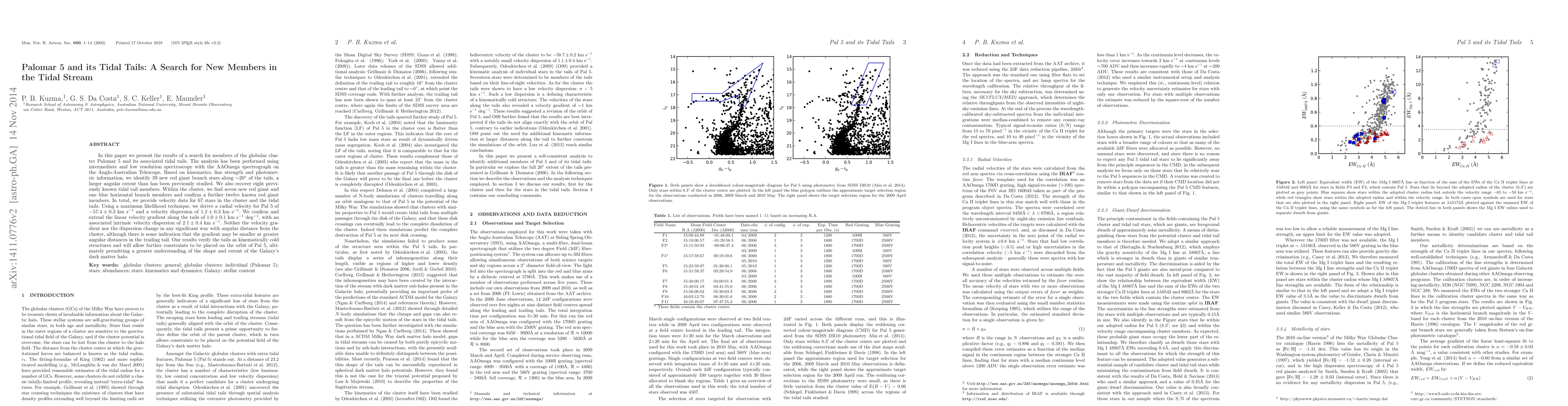 This paper identifies 39 new red giant branch stars in the tidal tails of globular cluster Palomar 5 and confirms eight previously known members, using spectroscopy and photometric data. The study provides velocity data for 67 stars, verifying the tails as kinematically cold structures and aiding in understanding the Galaxy's dark matter halo.