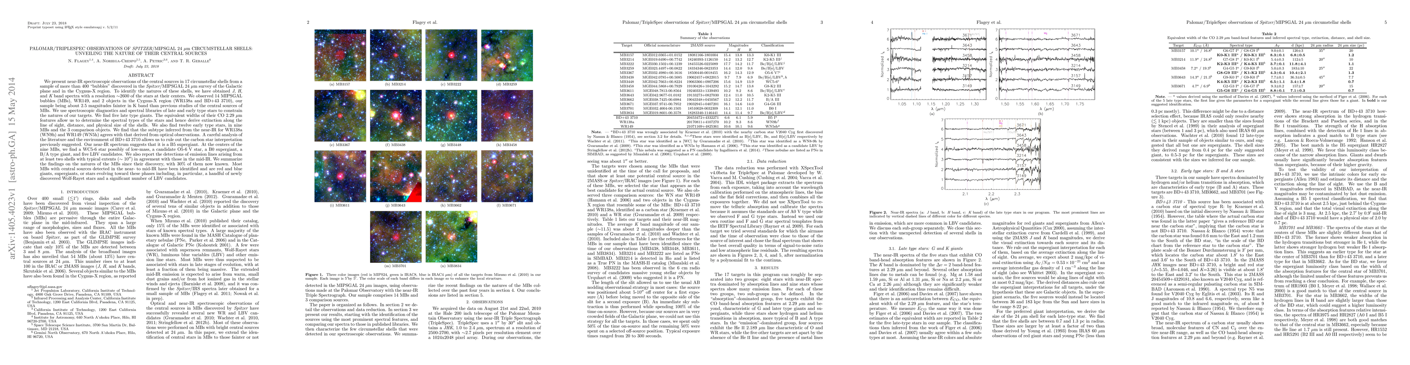 We present near-IR spectroscopic observations of the central sources in 17 circumstellar shells from a sample of more than 400 "bubbles" discovered in the Spitzer/MIPSGAL 24um survey of the Galactic plane and in the Cyg-X region. To identify these shells, we have obtained J, H, and K band spectra with a resolution ~2600 of the stars at their centers. We observed 14 MIPSGAL bubbles (MBs), WR149, and 2 objects in the Cyg-X region (WR138a and BD+43 3710), our sample being about 2.5 mag fainter in K band than previous studies of the central sources of MBs. We use spectroscopic diagnostics and spectral libraries to constrain the natures of our targets. We find five late type giants. The equivalent widths of their CO 2.29um features allow us to determine their spectral types and hence derive extinction along the line of sight, distance, and physical size of the shells. We also find twelve early type stars, in nine MBs and the 3 comparison objects. We find that the subtype inferred from the near-IR for WR138a (WN9h) and WR149 (WN5h) agrees with that derived from optical observations. A careful analysis of the literature and the environment of BD+43 3710 allows us to rule out the carbon star nature previously suggested. Our spectrum suggests that it is a B5I star. At the centers of the nine MBs, we find a candidate [WC5-6], a candidate O5-6V star, a B0 supergiant, a B/A type giant, and five LBV candidates. We report the detections of emission lines arising from two shells with typical extents (~10") in agreement with those in the mid-IR. We summarize the findings on the natures of the MBs since their discovery, with 30% of them now known. Most MBs with central sources detected in the near- to mid-IR have been identified and are red and blue (super)giants, or stars evolving toward these phases including a handful of newly discovered Wolf-Rayet stars and a significant number of LBV candidates.