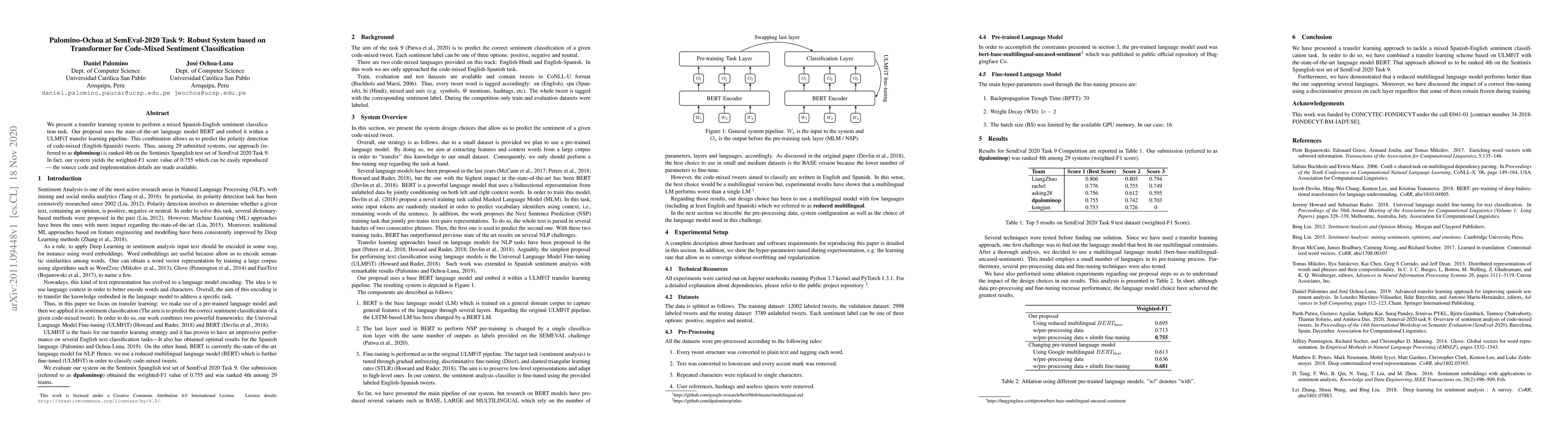 We present a transfer learning system to perform a mixed Spanish-English sentiment classification task. Our proposal uses the state-of-the-art language model BERT and embed it within a ULMFiT transfer learning pipeline. This combination allows us to predict the polarity detection of code-mixed (English-Spanish) tweets. Thus, among 29 submitted systems, our approach (referred to as dplominop) is ranked 4th on the Sentimix Spanglish test set of SemEval 2020 Task 9. In fact, our system yields the weighted-F1 score value of 0.755 which can be easily reproduced -- the source code and implementation details are made available.