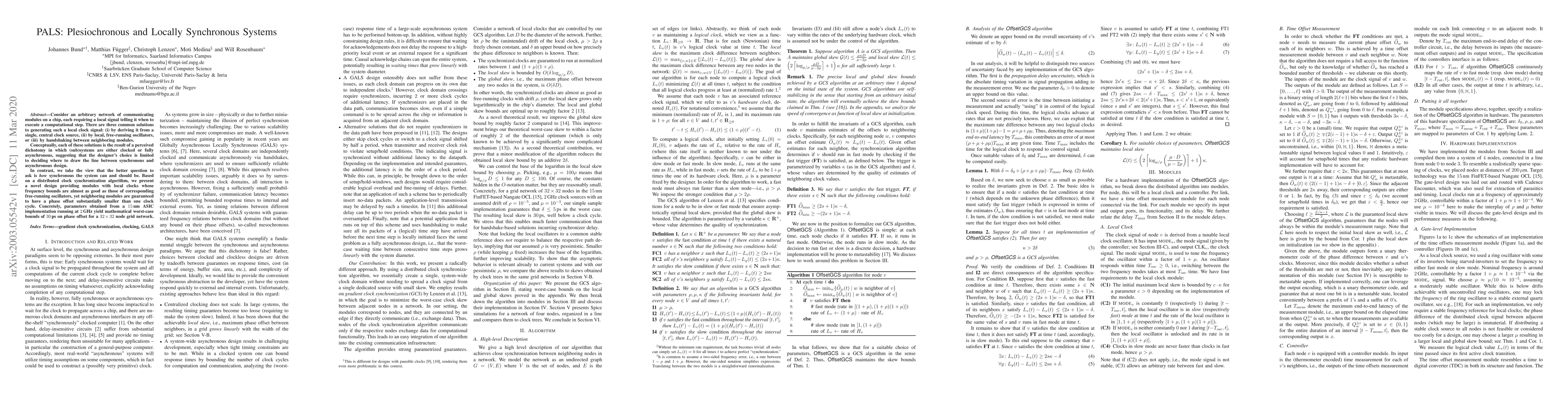 The paper introduces a plesiochronous and locally synchronous system (PALS) design based on a distributed clock synchronization algorithm, ensuring local clocks with tight frequency bounds and small phase offsets among neighboring modules.