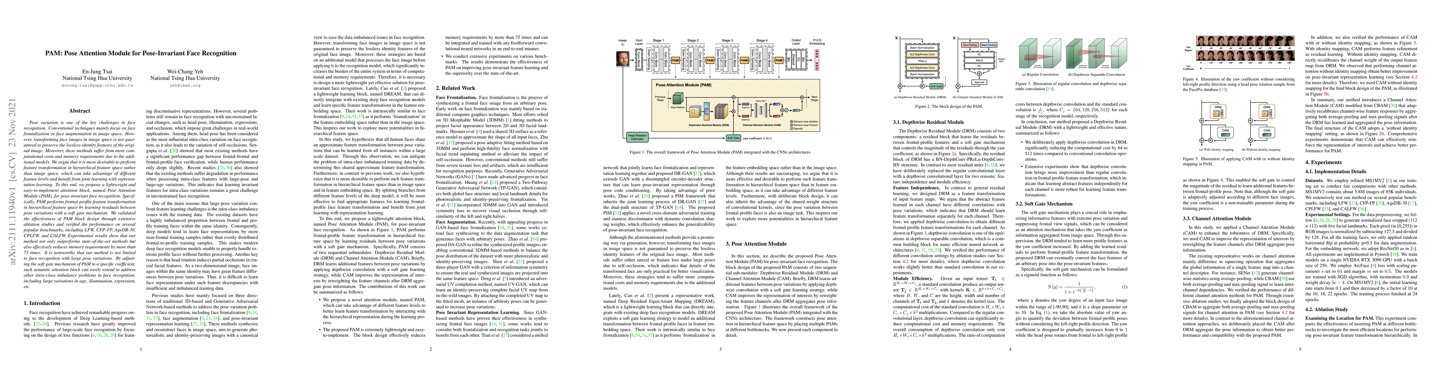 The paper proposes a Pose Attention Module (PAM) for pose-invariant face recognition, which performs frontal-profile feature transformation in hierarchical feature space to preserve identity features. The PAM outperforms state-of-the-art methods while significantly reducing memory requirements by over 75 times.