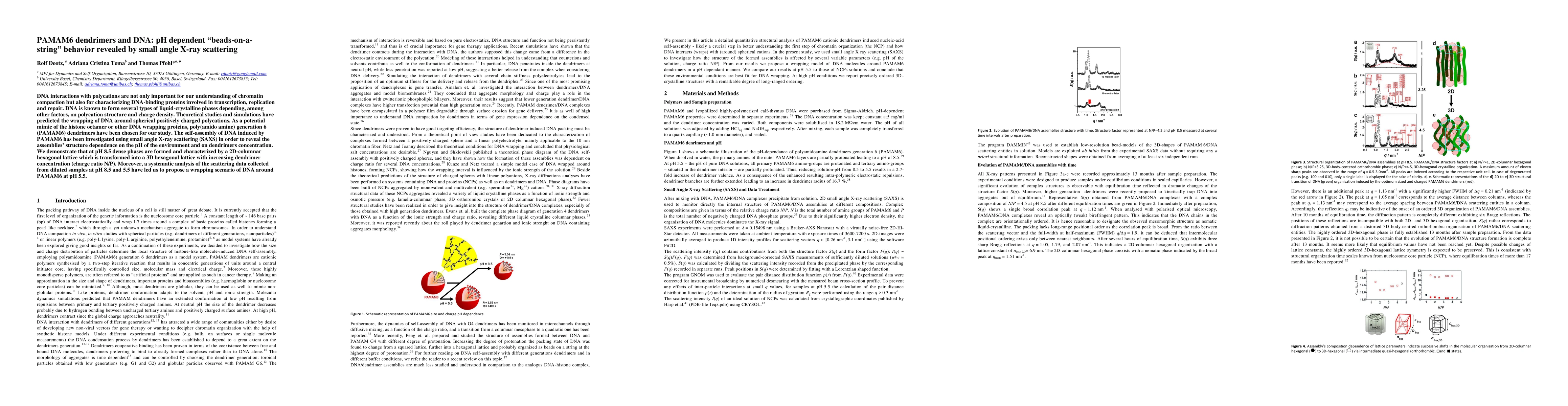 This study investigates the interaction between PAMAM6 dendrimers and DNA using small angle X-ray scattering to reveal structural changes dependent on pH and dendrimer concentration. At pH 8.5, DNA forms dense phases with a 3D hexagonal lattice, while at pH 5.5, a "beads-on-a-string" wrapping of DNA around PAMAM6 is proposed.