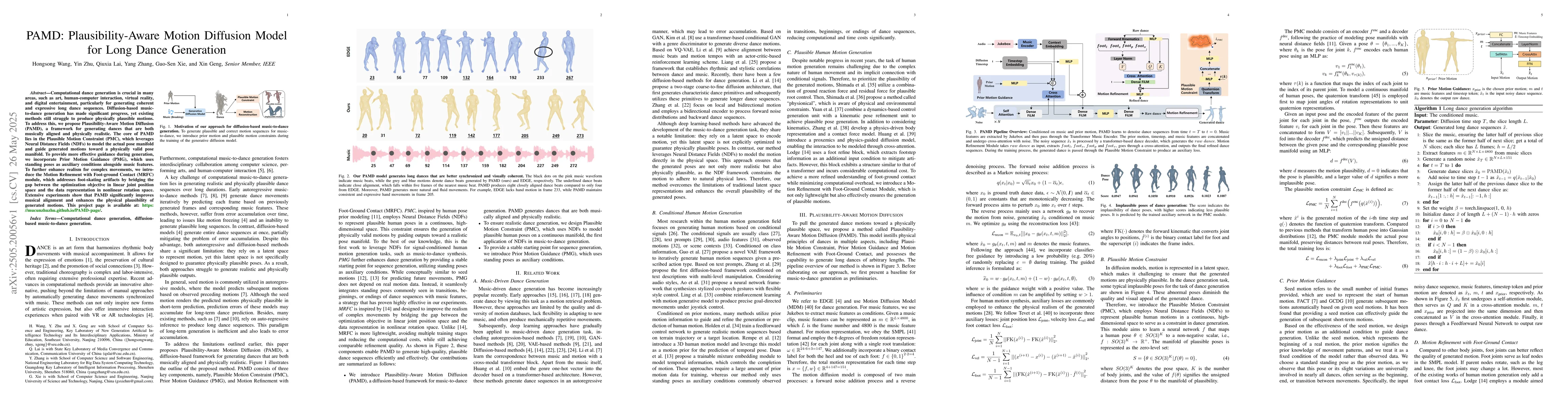 PAMD generates realistic dance sequences that align with music, using a combination of Neural Distance Fields, Prior Motion Guidance, and Motion Refinement with Foot-ground Contact to ensure physically plausible motions.