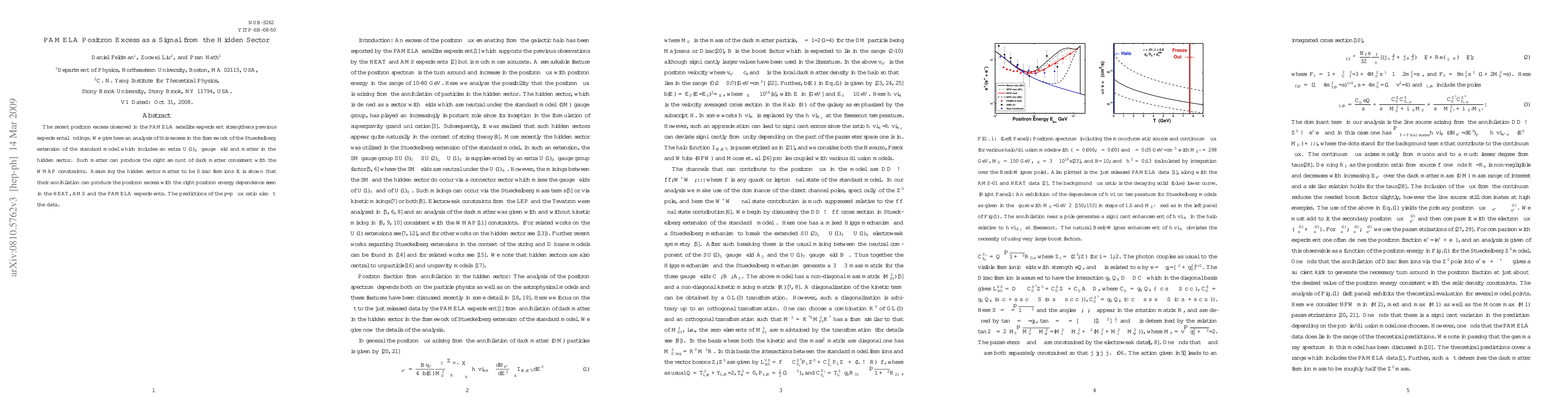 The PAMELA satellite experiment's observed positron excess is analyzed within a Stueckelberg extension of the standard model featuring an extra $U(1)_X$ gauge field and hidden sector matter, which could account for the positron excess and the correct dark matter abundance. The model's predictions align with WMAP constraints and could be tested at the Large Hadron Collider.