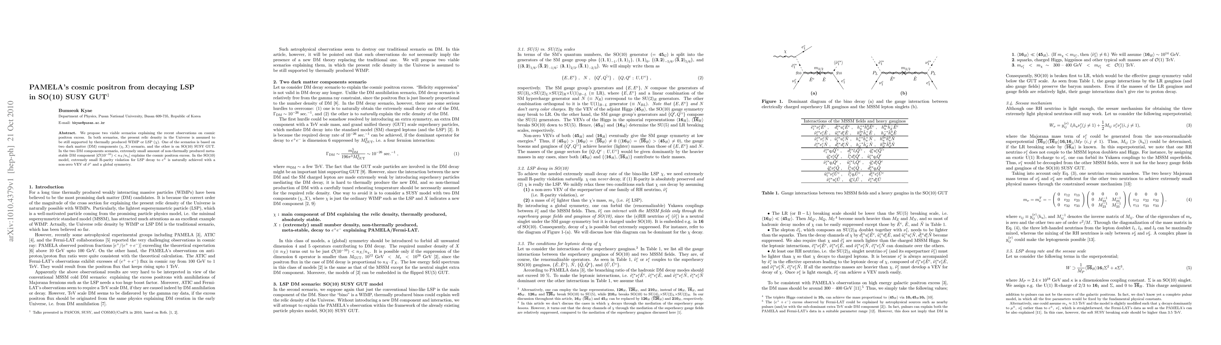 This paper proposes two scenarios to explain the cosmic positron excess observed by PAMELA, involving dark matter (DM) components and SUSY GUTs. In one scenario, a small non-thermal DM component explains the excess, while in the other, R-parity violation in SO(10) SUSY GUT with a non-zero VEV of the right-handed neutrino superpartner achieves the same result.