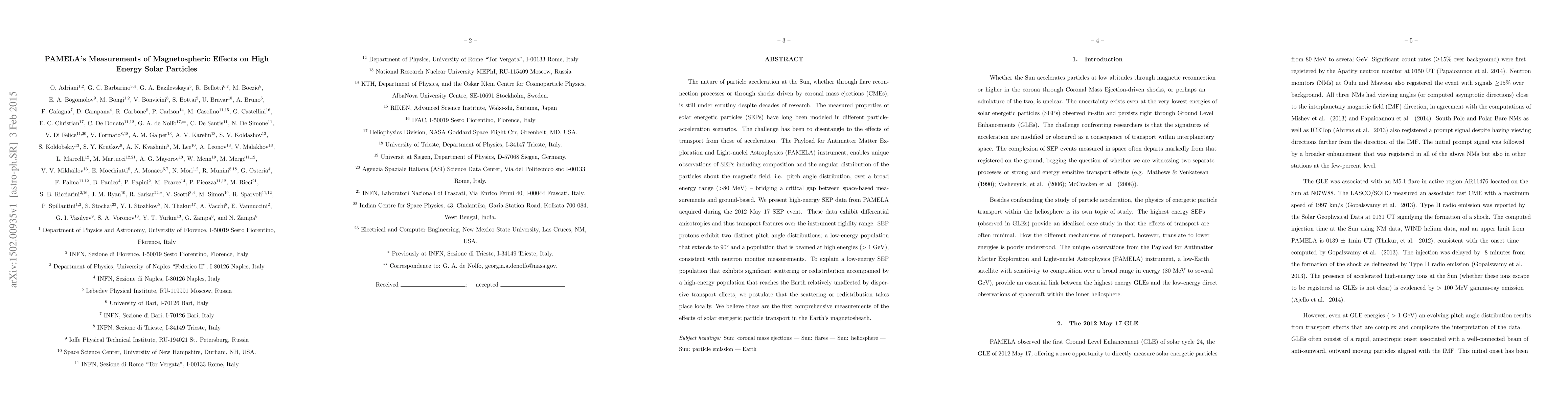 The nature of particle acceleration at the Sun, whether through flare reconnection processes or through shocks driven by coronal mass ejections (CMEs), is still under scrutiny despite decades of research. The measured properties of solar energetic particles (SEPs) have long been modeled in different particle-acceleration scenarios. The challenge has been to disentangle to the effects of transport from those of acceleration. The Payload for Antimatter Matter Exploration and Light-nuclei Astrophysics (PAMELA) instrument, enables unique observations of SEPs including composition and the angular distribution of the particles about the magnetic field, i.e. pitch angle distribution, over a broad energy range (>80 MeV) -- bridging a critical gap between space-based measurements and ground-based. We present high-energy SEP data from PAMELA acquired during the 2012 May 17 SEP event. These data exhibit differential anisotropies and thus transport features over the instrument rigidity range. SEP protons exhibit two distinct pitch angle distributions; a low-energy population that extends to 90{\deg} and a population that is beamed at high energies (>1 GeV), consistent with neutron monitor measurements. To explain a low-energy SEP population that exhibits significant scattering or redistribution accompanied by a high-energy population that reaches the Earth relatively unaffected by dispersive transport effects, we postulate that the scattering or redistribution takes place locally. We believe these are the first comprehensive measurements of the effects of solar energetic particle transport in the Earth's magnetosheath.