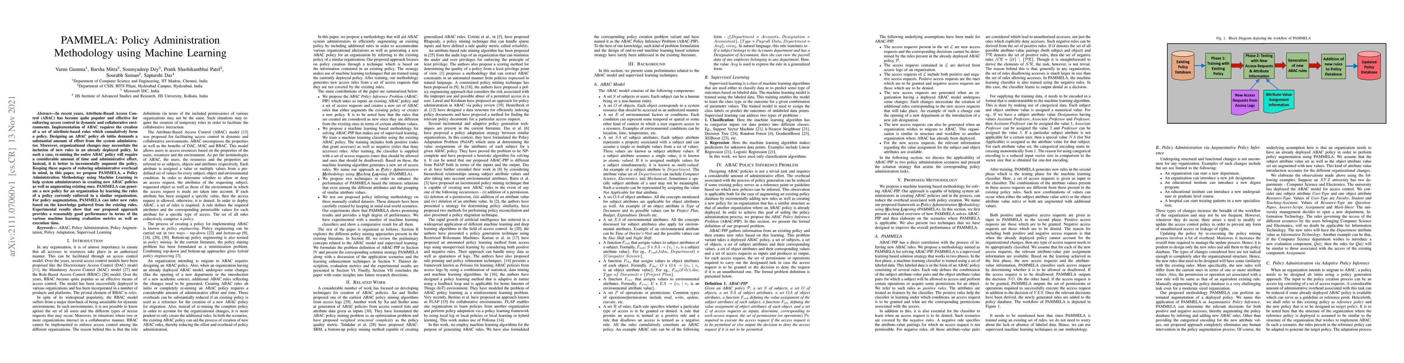 PAMMELA is a machine learning methodology designed to streamline the creation and augmentation of Attribute-Based Access Control (ABAC) policies, reducing administrative overhead and enhancing efficiency. Experimental results indicate its effectiveness in generating and updating policies based on existing rules.