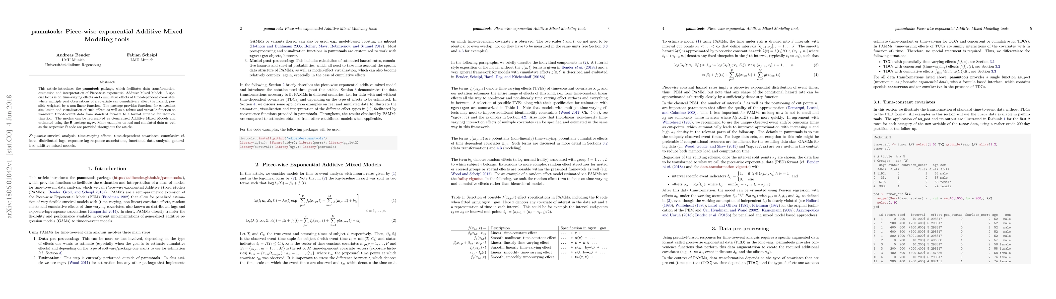 This article introduces the pammtools package, which facilitates data transformation, estimation and interpretation of Piece-wise exponential Additive Mixed Models. A special focus is on time-varying effects and cumulative effects of time-dependent covariates, where multiple past observations of a covariate can cumulatively affect the hazard, possibly weighted by a non-linear function. The package provides functions for convenient simulation and visualization of such effects as well as a robust and versatile function to transform time-to-event data from standard formats to a format suitable for their estimation. The models can be represented as Generalized Additive Mixed Models and estimated using the R package mgcv. Many examples on real and simulated data as well as the respective R code are provided throughout the article.