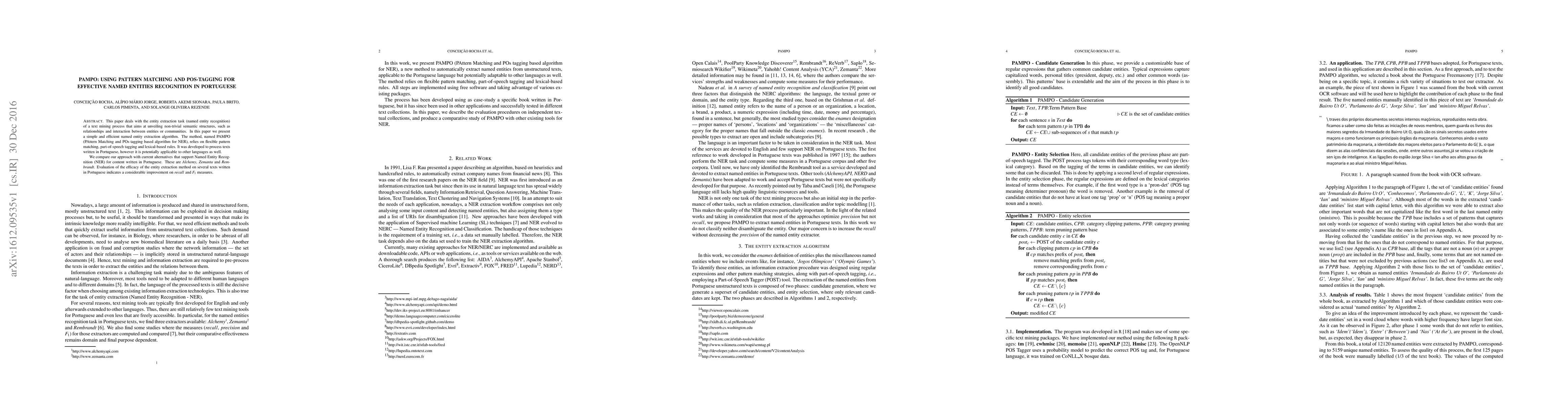 The paper introduces PAMPO, a named entity recognition algorithm for Portuguese text using pattern matching and part-of-speech tagging. It outperforms existing alternatives like Alchemy, Zemanta, and Rembrandt in recall and F_1 measures, demonstrating potential applicability to other languages.