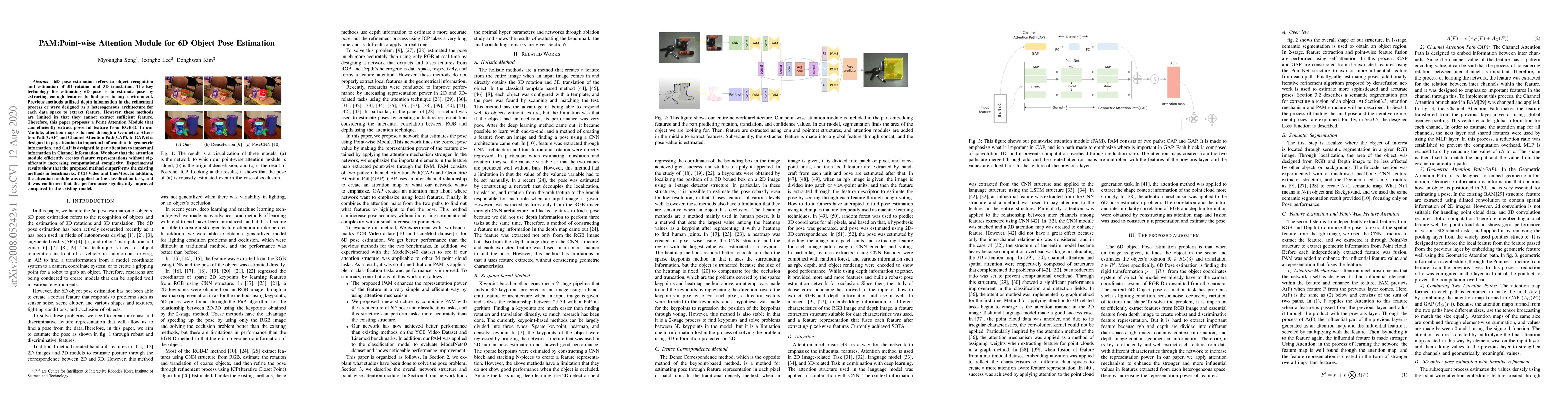This paper introduces a Point-wise Attention Module (PAM) for 6D object pose estimation, which efficiently extracts features from RGB-D data using a Geometric Attention Path and Channel Attention Path. The proposed method outperforms existing techniques in benchmarks and also improves classification performance.