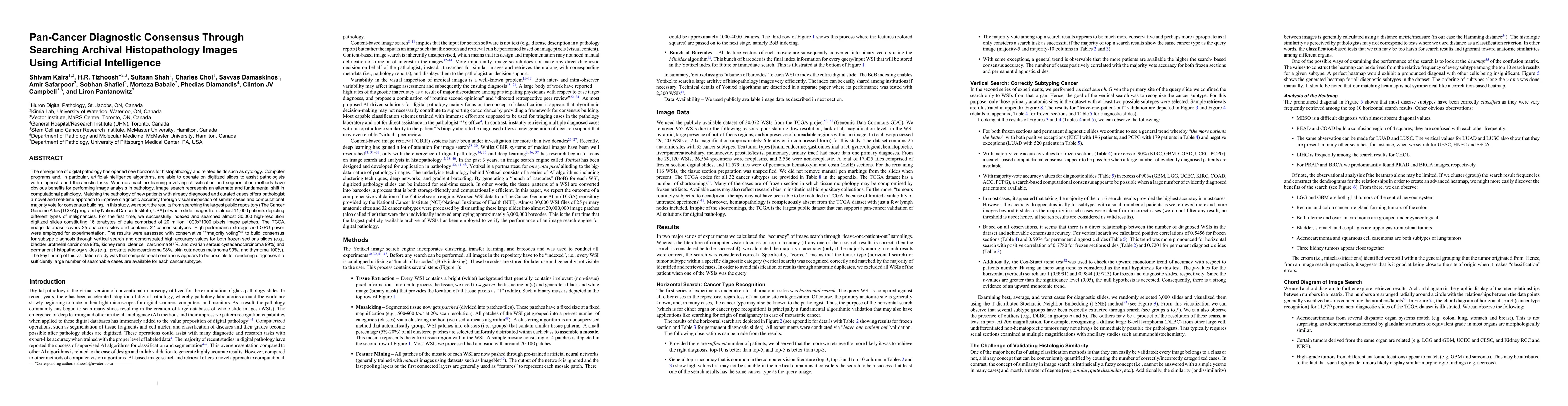 This study leverages artificial intelligence to search and index archival histopathology images from nearly 11,000 patients in the TCGA database, achieving high diagnostic accuracy through computational majority voting for consensus. The results indicate that a large repository of digitized slides can significantly improve diagnostic accuracy for various cancer subtypes.