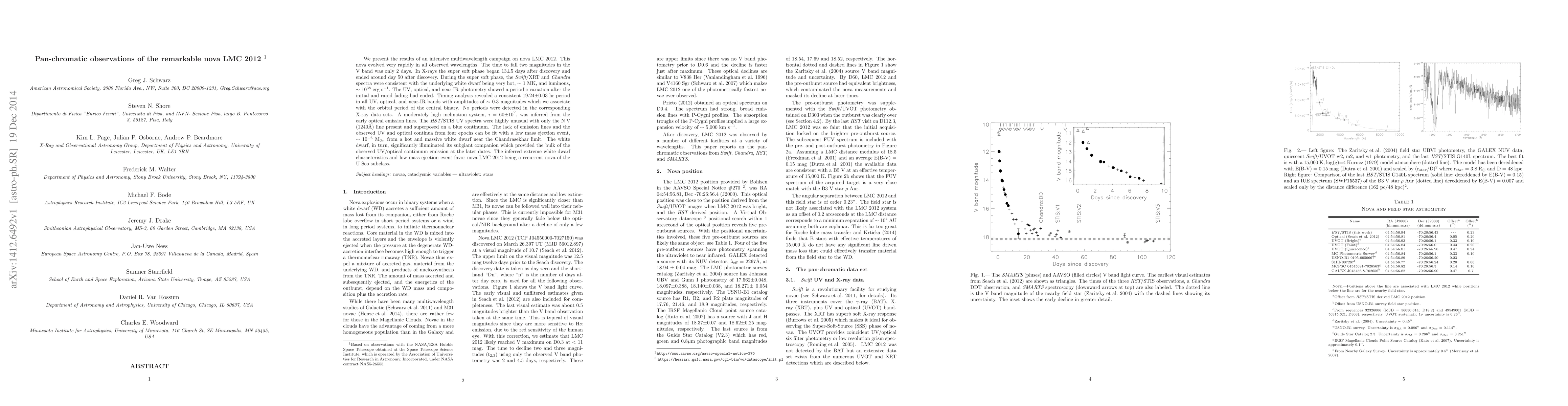 The nova LMC 2012 exhibited extremely rapid evolution in multiple wavelengths, with a 2-day decline in brightness, followed by a super soft X-ray phase lasting around 50 days. The observations revealed a periodic orbital variation and characteristics suggesting it was a recurrent nova.