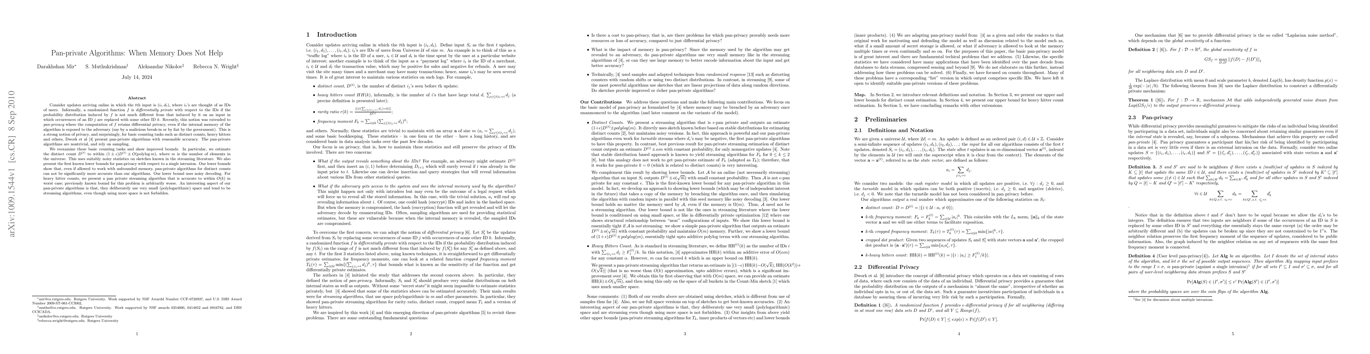 Researchers present pan-private algorithms for basic counting tasks like distinct counts and heavy hitters, achieving improved bounds with reasonable accuracy, while highlighting the limitations of pan-privacy in terms of memory usage and accuracy.