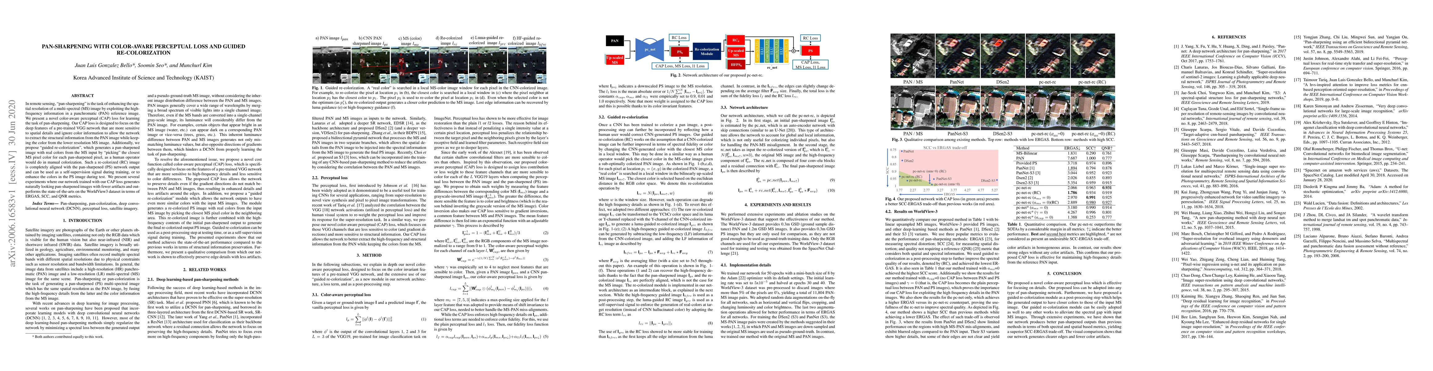 This paper introduces a novel color-aware perceptual loss for pan-sharpening that focuses on spatial details while preserving color from a lower resolution image. It also proposes guided re-colorization to enhance the pan-sharpened image's colors, achieving better results than state-of-the-art methods on the WorldView3 dataset.