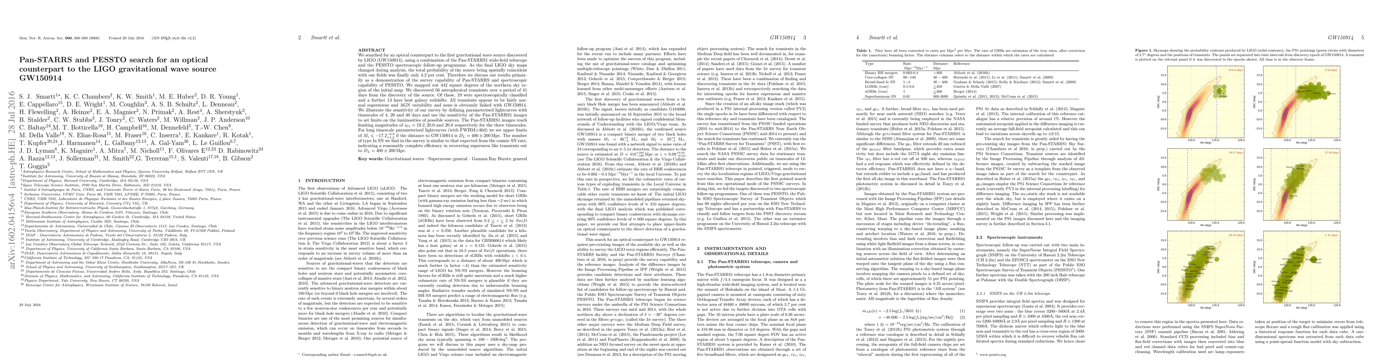 Researchers used Pan-STARRS1 and PESSTO to search for an optical counterpart to GW150914, finding 56 astrophysical transients but none linked to the gravitational wave source.
