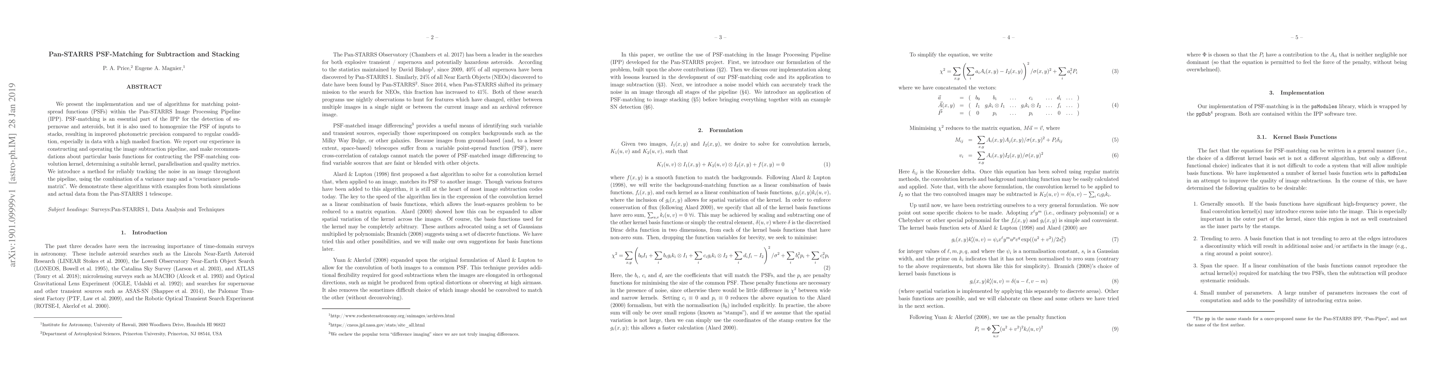 The paper details the implementation and application of PSF-matching algorithms in Pan-STARRS Image Processing Pipeline for supernova and asteroid detection, as well as improving photometric precision in stacks. It provides recommendations on kernel construction, parallelisation, and quality metrics, and introduces a method for tracking image noise using variance maps and covariance pseudo-matrices, supported by simulation and real Pan-STARRs1 telescope data.