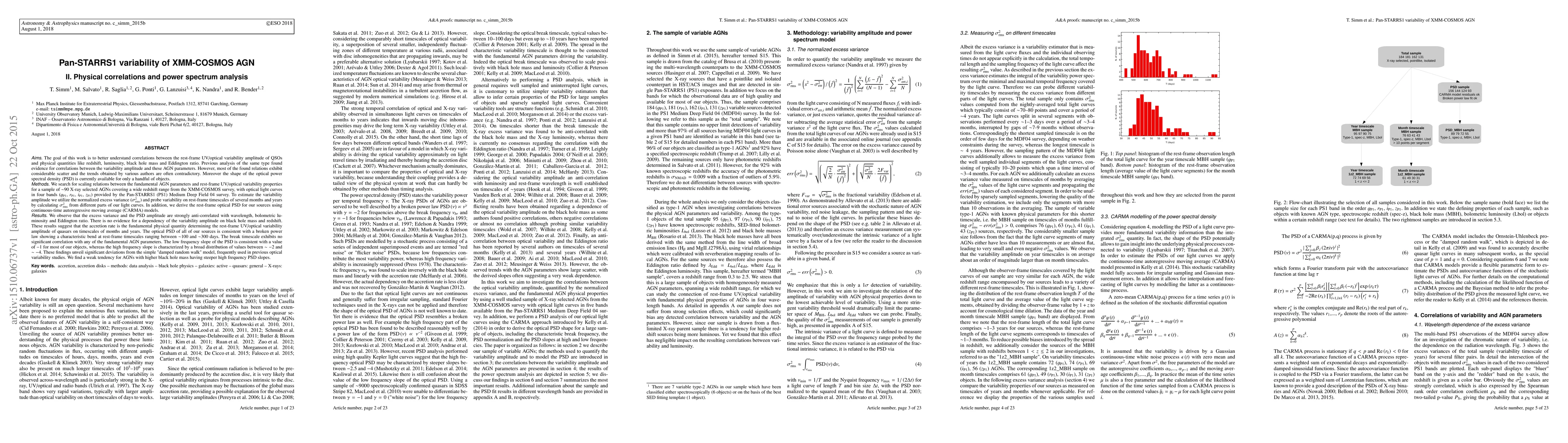 [Abbreviated] We search for scaling relations between the fundamental AGN parameters and rest-frame UV/optical variability properties for a sample of $\sim$90 X-ray selected AGNs covering a wide redshift range from the XMM-COSMOS survey, with optical light curves in four bands provided by the Pan-STARRS1 (PS1) Medium Deep Field 04 survey. To estimate the variability amplitude we utilize the normalized excess variance ($\sigma_{\mathrm{rms}}^{2}$) and probe variability on rest-frame timescales of several months and years by calculating $\sigma_{\mathrm{rms}}^{2}$ from different parts of our light curves. In addition, we derive the rest-frame optical PSD for our sources using continuous-time autoregressive moving average (CARMA) models. We observe that the excess variance and the PSD amplitude are strongly anti-correlated with wavelength, bolometric luminosity and Eddington ratio. There is no evidence for a dependency of the variability amplitude on black hole mass and redshift. These results suggest that the accretion rate is the fundamental physical quantity determining the rest-frame UV/optical variability amplitude of quasars on timescales of months and years. The optical PSD of all of our sources is consistent with a broken power law showing a characteristic bend at rest-frame timescales ranging between $\sim$100 and $\sim$300 days. The break timescale exhibits no significant correlation with any of the fundamental AGN parameters. The low frequency slope of the PSD is consistent with a value of $-1$ for most of our objects, whereas the high frequency slope is characterized by a broad distribution of values between $\sim-2$ and $\sim-4$. These findings unveil significant deviations from the simple "damped random walk" model, frequently used in previous optical variability studies. We find a weak tendency for AGNs with higher black hole mass having steeper high frequency PSD slopes.