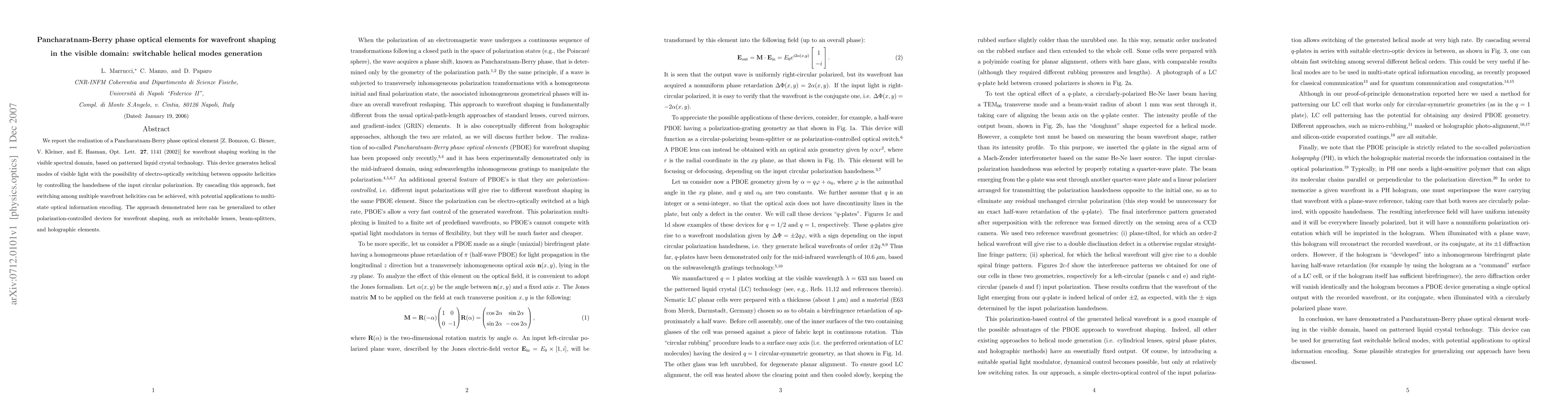 This paper presents a Pancharatnam-Berry phase optical element based on liquid crystal technology for generating helical modes in the visible spectrum, enabling electro-optical switching between opposite helicities. The approach allows for fast switching among multiple wavefront helicities, with potential applications in multi-state optical information encoding.