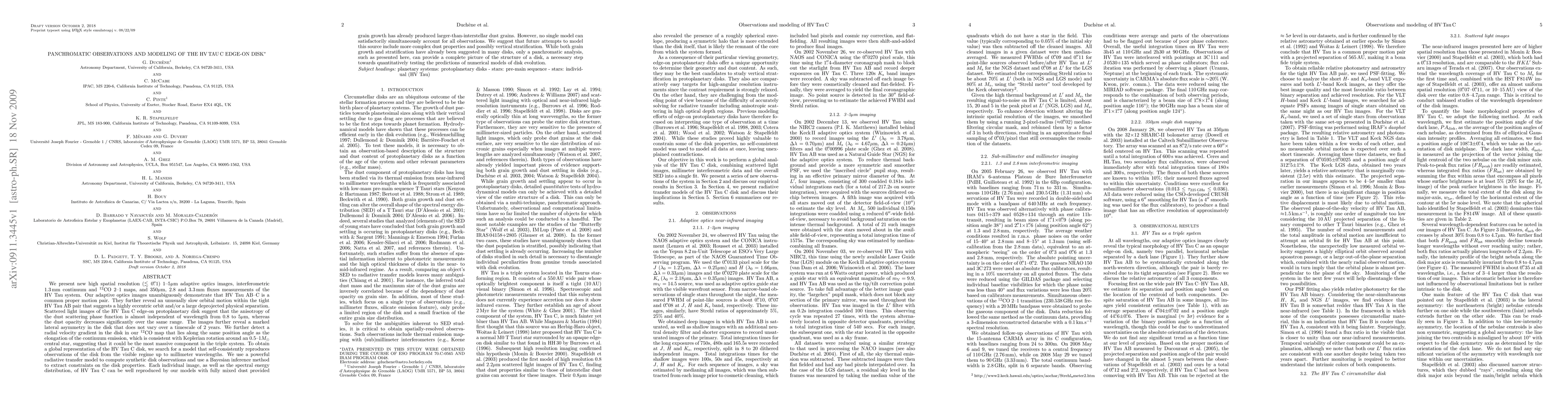 We present new high spatial resolution (<~ 0.1") 1-5 micron adaptive optics images, interferometric 1.3 mm continuum and 12CO 2-1 maps, and 350 micron, 2.8 and 3.3 mm fluxes measurements of the HV Tau system. Our adaptive optics images reveal an unusually slow orbital motion within the tight HV Tau AB pair that suggests a highly eccentric orbit and/or a large deprojected physical separation. Scattered light images of the HV Tau C edge-on protoplanetary disk suggest that the anisotropy of the dust scattering phase function is almost independent of wavelength from 0.8 to 5 micron, whereas the dust opacity decreases significantly over the same range. The images further reveal a marked lateral asymmetry in the disk that does not vary over a timescale of 2 years. We further detect a radial velocity gradient in the disk in our 12CO map that lies along the same position angle as the elongation of the continuum emission, which is consistent with Keplerian rotation around an 0.5-1 Msun central star, suggesting that it could be the most massive component in the triple system. We use a powerful radiative transfer model to compute synthetic disk observations and use a Bayesian inference method to extract constraints on the disk properties. Each individual image, as well as the spectral energy distribution, of HV Tau C can be well reproduced by our models with fully mixed dust provided grain growth has already produced larger-than-interstellar dust grains. However, no single model can satisfactorily simultaneously account for all observations. We suggest that future attempts to model this source include more complex dust properties and possibly vertical stratification. (Abridged)