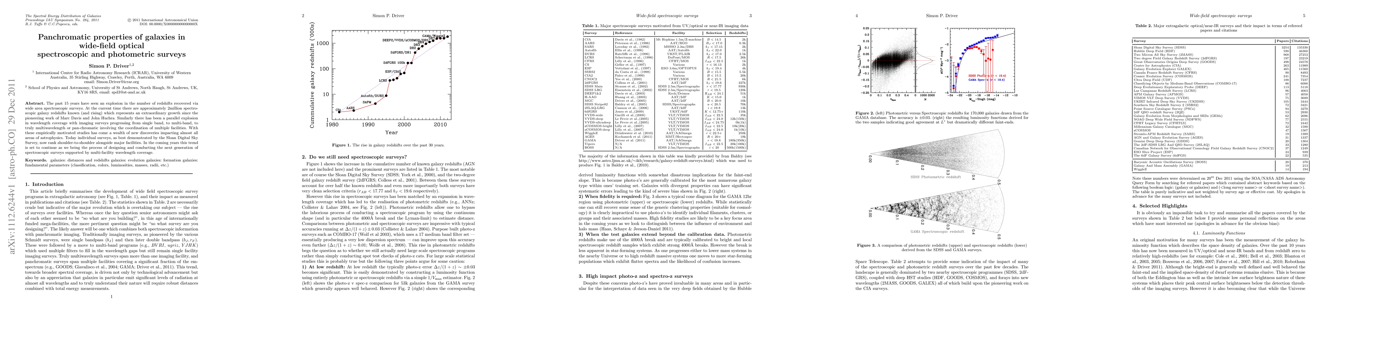 The past 15 years have seen an explosion in the number of redshifts recovered via wide area spectroscopic surveys. At the current time there are approximately 2million spectroscopic galaxy redshifts known (and rising) which represents an extraordinary growth since the pioneering work of Marc Davis and John Huchra. Similarly there has been a parallel explosion in wavelength coverage with imaging surveys progressing from single band, to multi-band, to truly multiwavelength or pan-chromatic involving the coordination of multiple facilities. With these empirically motivated studies has come a wealth of new discoveries impacting almost all areas of astrophysics. Today individual surveys, as best demonstrated by the Sloan Digital Sky Survey, now rank shoulder-to-shoulder alongside major facilities. In the coming years this trend is set to continue as we being the process of designing and conducting the next generation of spectroscopic surveys supported by multi-facility wavelength coverage.