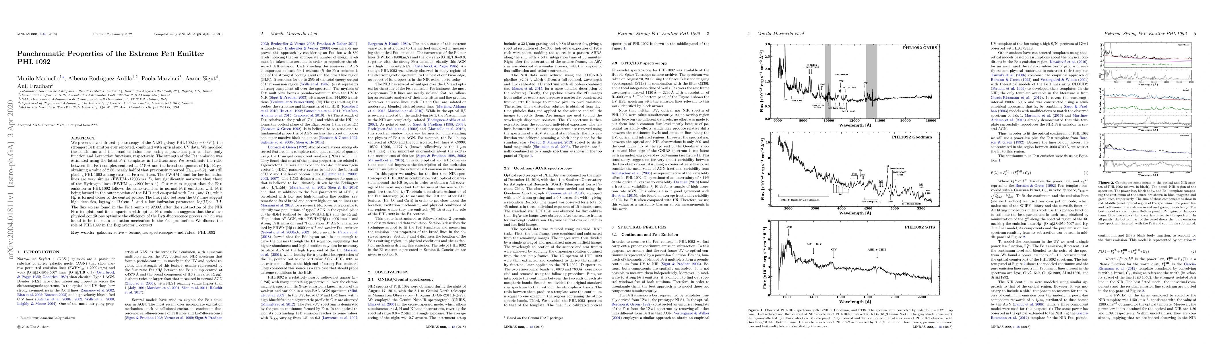 We present near-infrared spectroscopy of the NLS1 galaxy PHL1092 (z=0.394), the strongest FeII emitter ever reported, combined with optical and UV data. We modeled the continuum and the broad emission lines using a power-law plus a black body function and Lorentzian functions, respectively. The strength of the FeII emission was estimated using the latest FeII templates in the literature. We re-estimate the ratio between the FeII complex centered at 4570Ang and the broad component of H-Beta, R_FeII, obtaining a value of 2.58, nearly half of that previously reported (R_FeII=6.2), but still placing PHL1092 among extreme FeII emitters. The FWHM found for low ionization lines are very similar (FWHM~1200km/s), but significantly narrower than those of the Hydrogen lines (FWHM(H-Beta)~1900km/s). Our results suggest that the FeII emission in PHL1092 follows the same trend as in normal FeII emitters, with FeII being formed in the outer portion of the BLR and co-spatial with CaII, and OI, while H-Beta is formed closer to the central source. The flux ratio between the UV lines suggest high densities, log(n_H)~13.0 cm^{-3}, and a low ionization parameter, log(U)~-3.5. The flux excess found in the FeII bump at 9200Ang after the subtraction of the NIR FeII template and its comparison with optical FeII emission suggests that the above physical conditions optimize the efficiency of the ly-Alpha fluorescence process, which was found to be the main excitation mechanism in the FeII production. We discuss the role of PHL1092 in the Eigenvector 1 context.