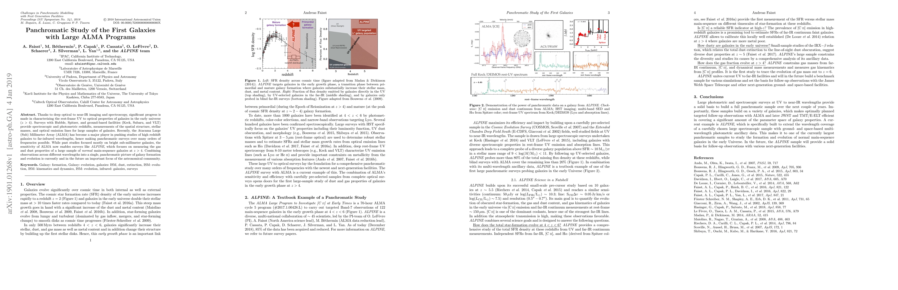 Thanks to deep optical to near-IR imaging and spectroscopy, significant progress is made in characterizing the rest-frame UV to optical properties of galaxies in the early universe (z > 4). Surveys with Hubble, Spitzer, and ground-based facilities (Keck, Subaru, and VLT) provide spectroscopic and photometric redshifts, measurements of the spatial structure, stellar masses, and optical emission lines for large samples of galaxies. Recently, the Atacama Large (Sub) Millimeter Array (ALMA) has become a major player in pushing studies of high redshift galaxies to far-infrared wavelengths, hence making panchromatic surveys over many orders of frequencies possible. While past studies focused mostly on bright sub-millimeter galaxies, the sensitivity of ALMA now enables surveys like ALPINE, which focuses on measuring the gas and dust properties of a large sample of normal main-sequence galaxies at z > 4. Combining observations across different wavelengths into a single, panchromatic picture of galaxy formation and evolution is currently and in the future an important focus of the astronomical community.