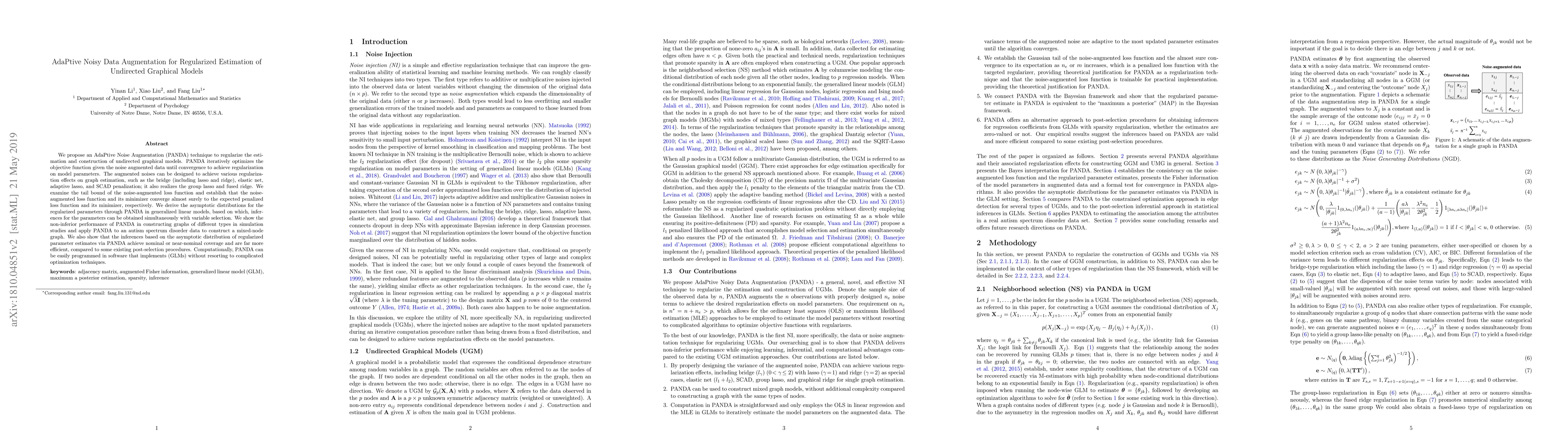 The paper proposes PANDA, an adaptive noise augmentation technique for regularizing undirected graphical models. It iteratively optimizes the objective function given noise-augmented data until convergence, achieving various regularization effects such as bridge penalties (including lasso and ridge), elastic net, adaptive lasso, SCAD penalization, group lasso, and fused ridge.