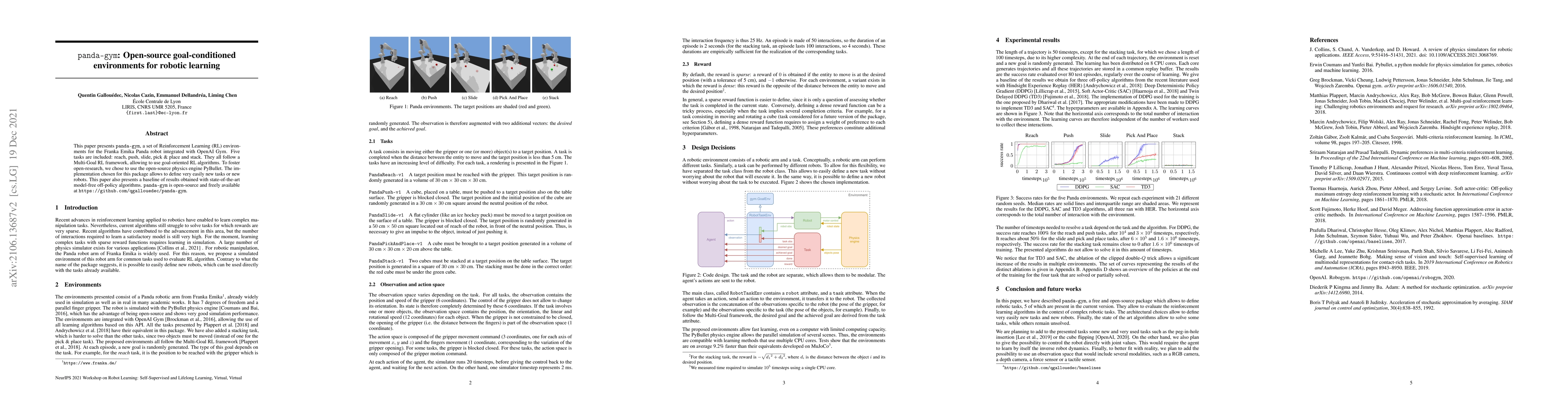 This paper introduces panda-gym, an open-source suite of goal-conditioned environments for the Franka Emika Panda robot, utilizing the PyBullet physics engine and integrated with the OpenAI Gym framework. It includes five tasks and provides a baseline using state-of-the-art off-policy algorithms, all aimed at fostering open-research in robotic reinforcement learning.