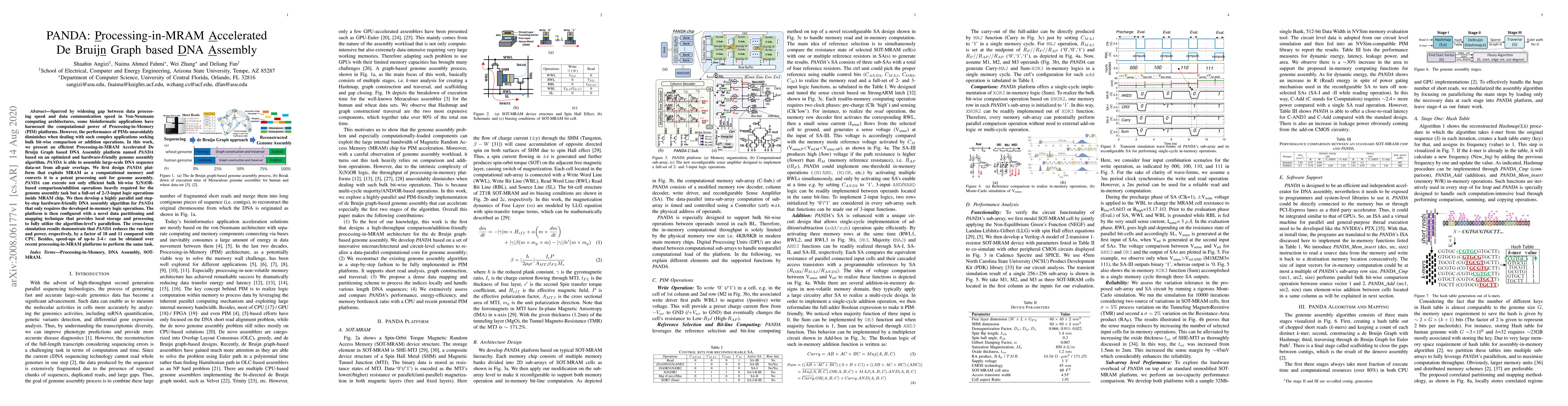 Spurred by widening gap between data processing speed and data communication speed in Von-Neumann computing architectures, some bioinformatic applications have harnessed the computational power of Processing-in-Memory (PIM) platforms. However, the performance of PIMs unavoidably diminishes when dealing with such complex applications seeking bulk bit-wise comparison or addition operations. In this work, we present an efficient Processing-in-MRAM Accelerated De Bruijn Graph based DNA Assembly platform named PANDA based on an optimized and hardware-friendly genome assembly algorithm. PANDA is able to assemble large-scale DNA sequence data-set from all-pair overlaps. We first design PANDA platform that exploits MRAM as a computational memory and converts it to a potent processing unit for genome assembly. PANDA can execute not only efficient bulk bit-wise X(N)OR-based comparison/addition operations heavily required for the genome assembly task but a full-set of 2-/3-input logic operations inside MRAM chip. We then develop a highly parallel and step-by-step hardware-friendly DNA assembly algorithm for PANDA that only requires the developed in-memory logic operations. The platform is then configured with a novel data partitioning and mapping technique that provides local storage and processing to fully utilize the algorithm-level's parallelism. The cross-layer simulation results demonstrate that PANDA reduces the run time and power, respectively, by a factor of 18 and 11 compared with CPU. Besides, speed-ups of up-to 2-4x can be obtained over recent processing-in-MRAM platforms to perform the same task.